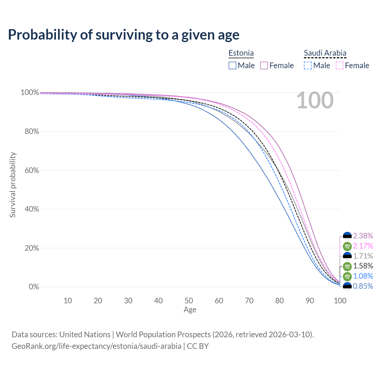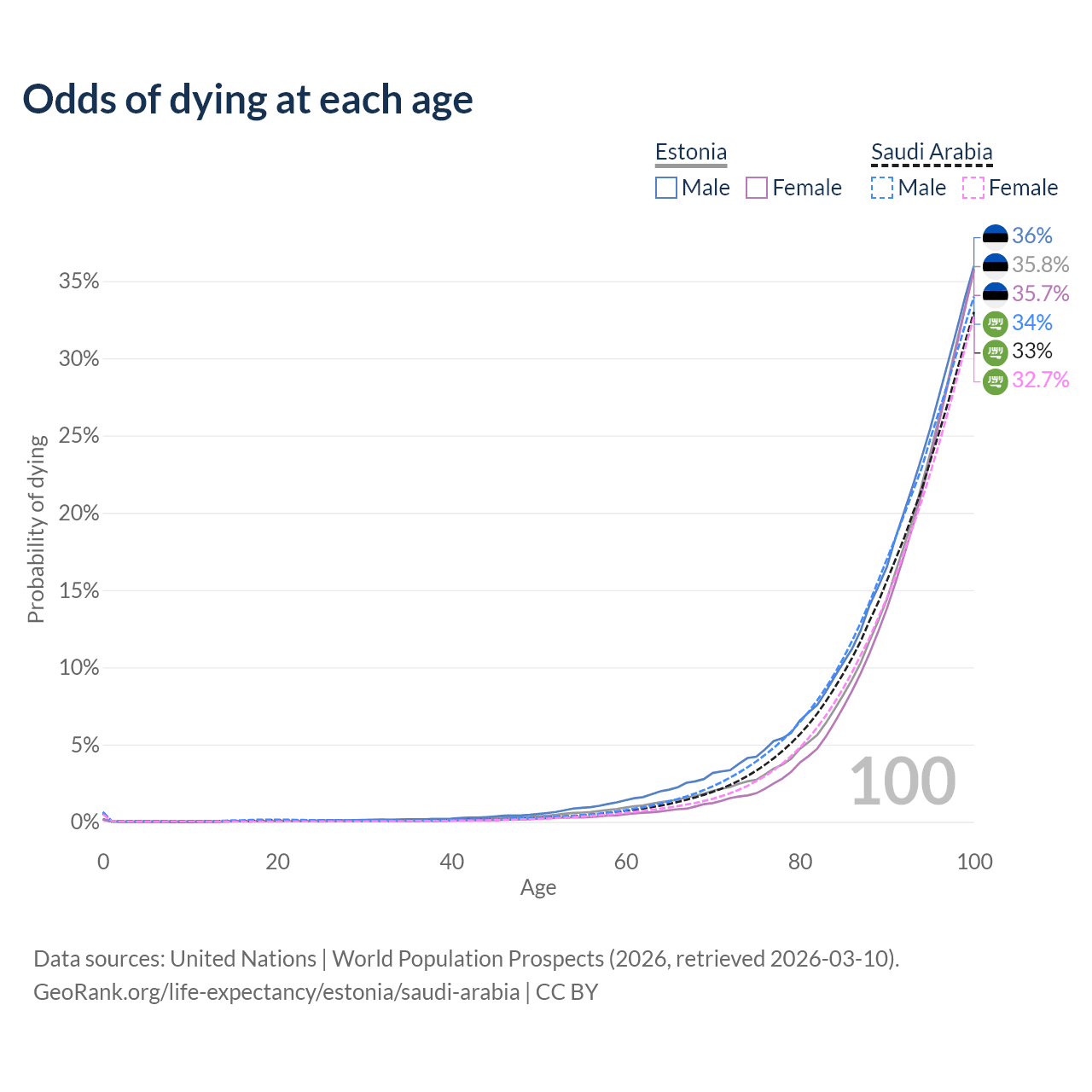This life expectancy calculator shows the odds of living to 100, 95, 90, and below based on current age for both males and females in Estonia and Saudi Arabia, along with mean and median age of death. The calculations are based on the 2026 life tables (actuarial tables) from the UN World Population Prospects.