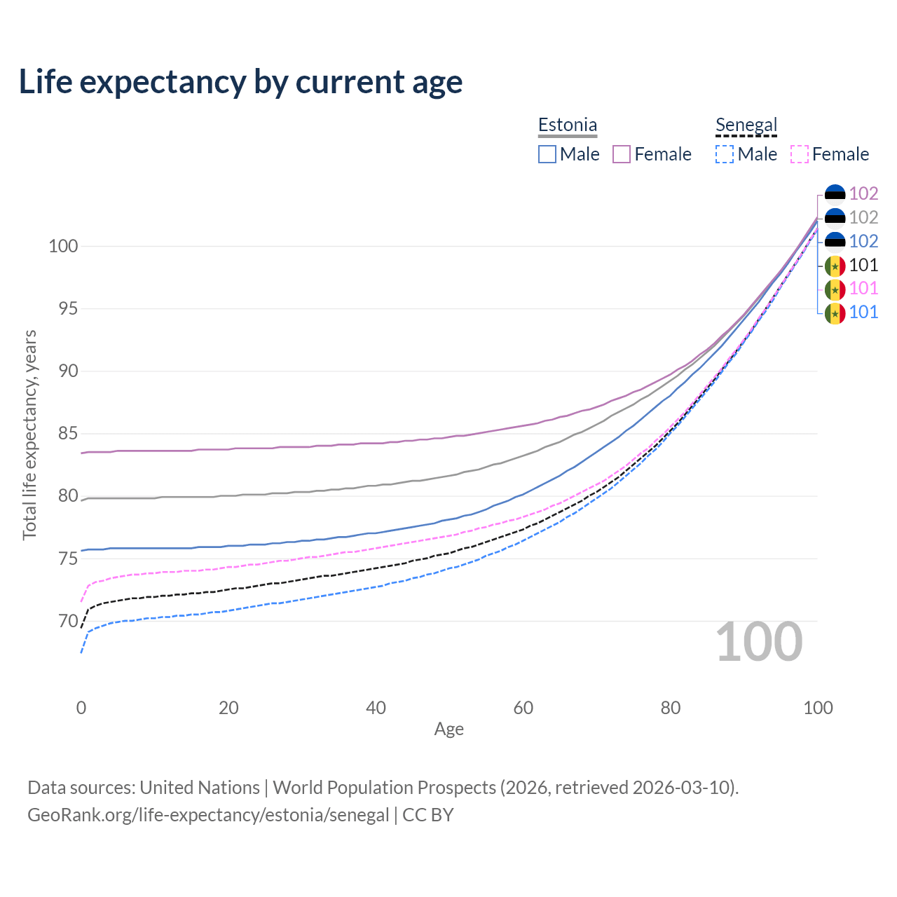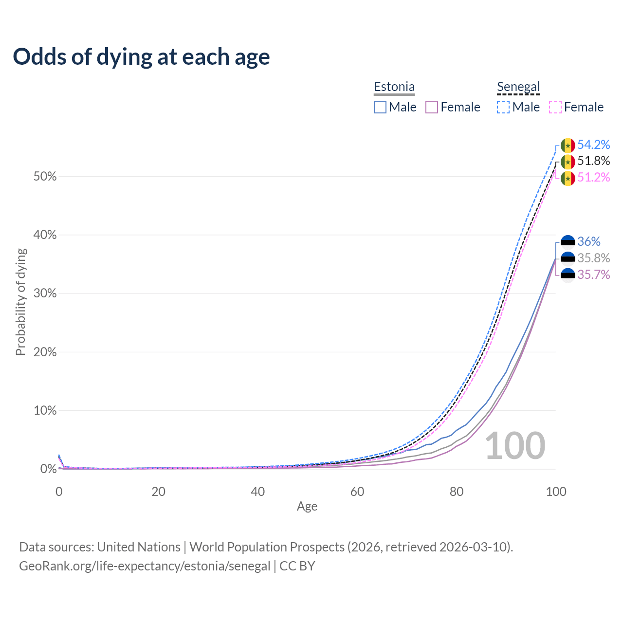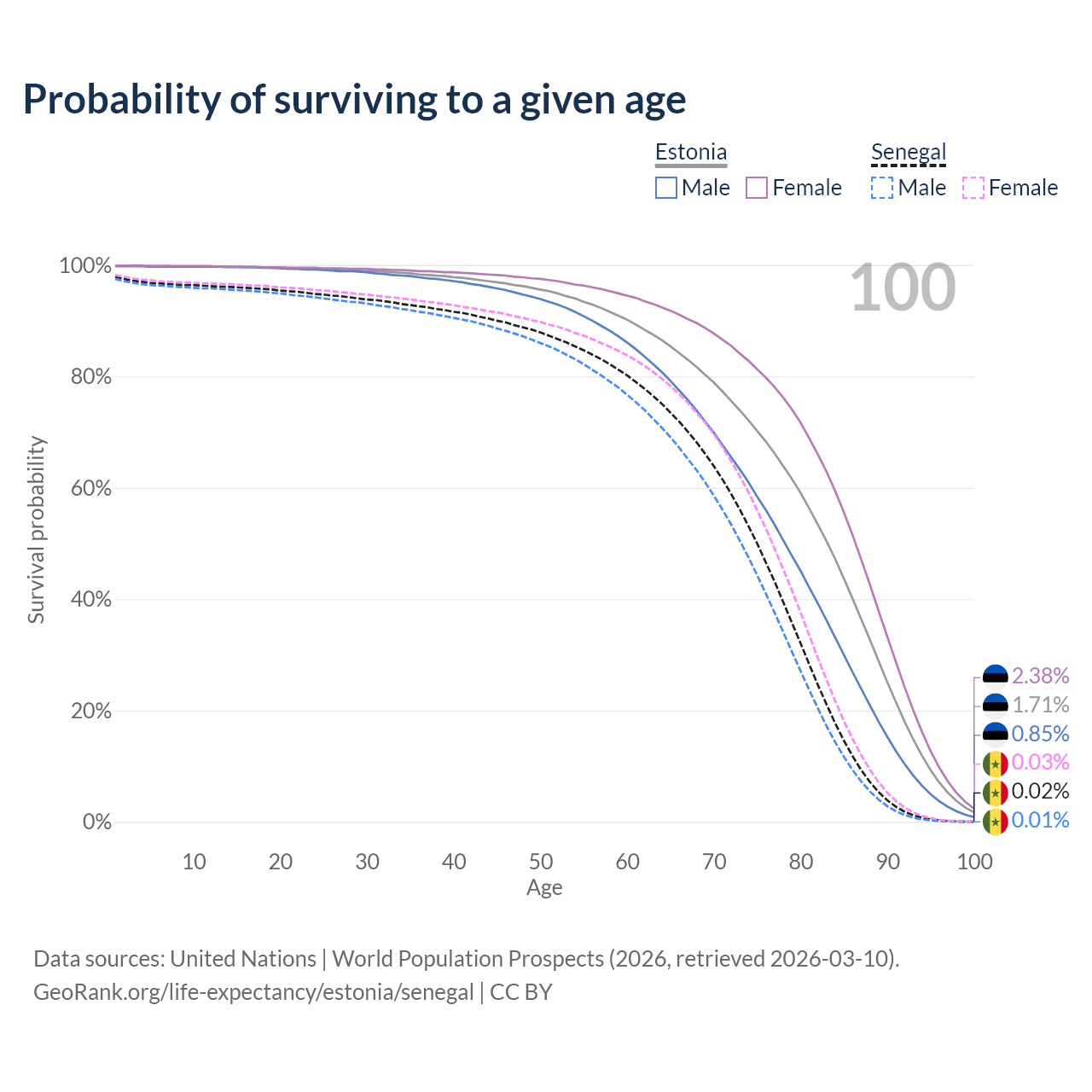 This life expectancy calculator shows the odds of living to 100, 95, 90, and below based on current age for both males and females in Estonia and Senegal, along with mean and median age of death. The calculations are based on the 2026 life tables (actuarial tables) from the UN World Population Prospects.