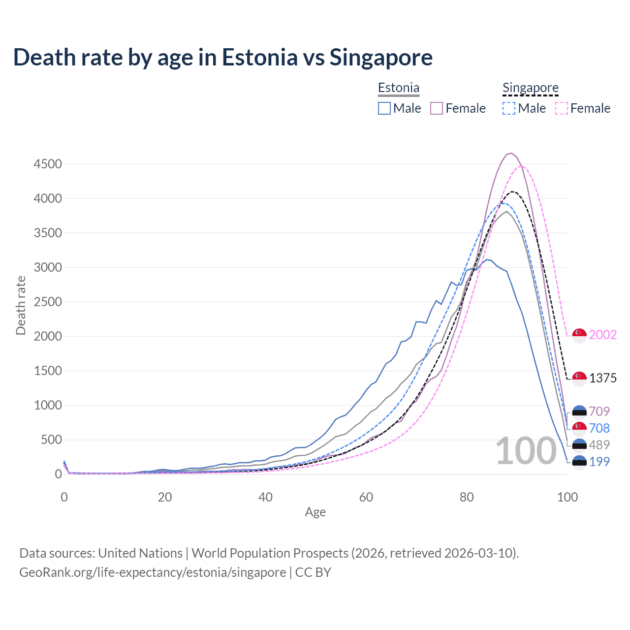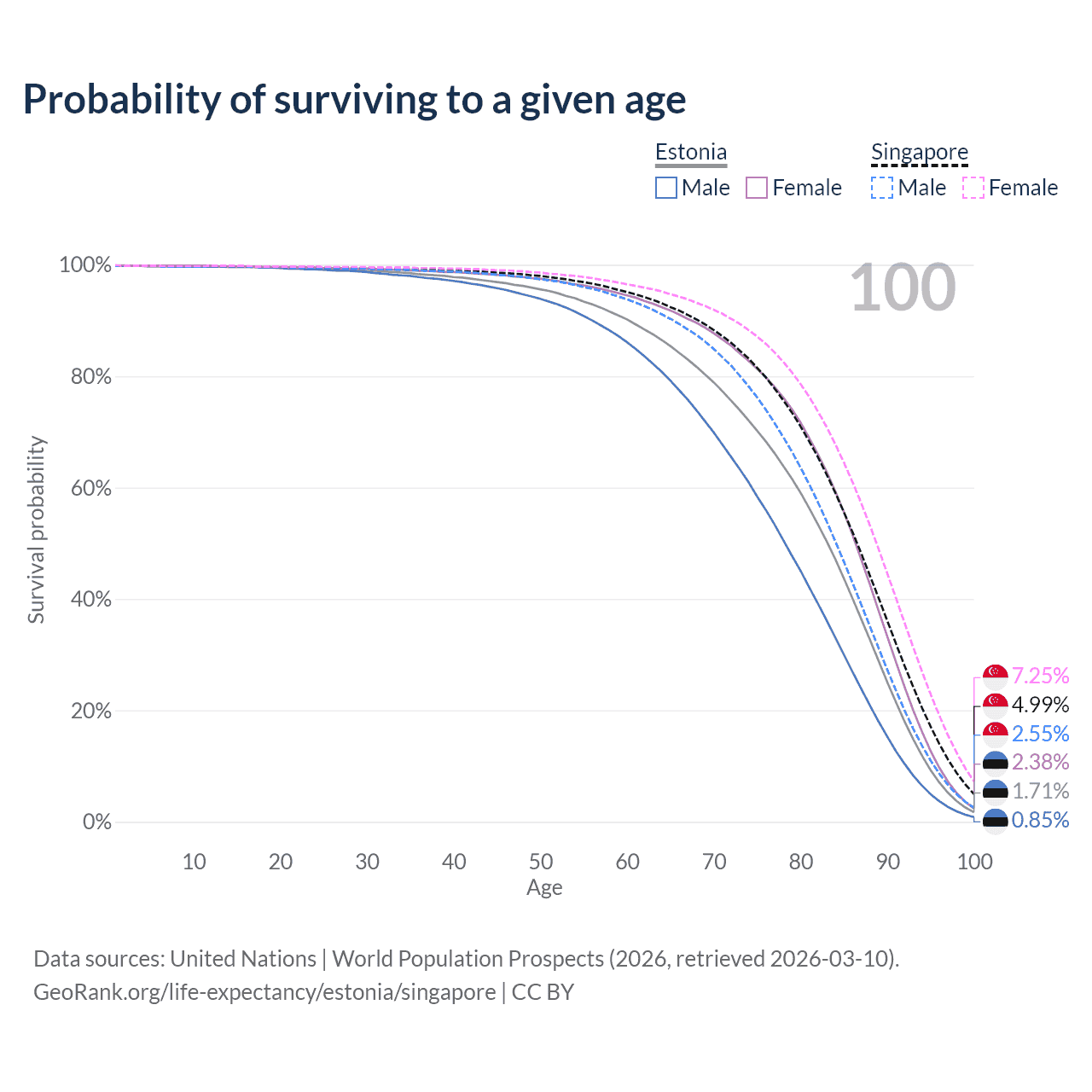 This life expectancy calculator shows the odds of living to 100, 95, 90, and below based on current age for both males and females in Estonia and Singapore, along with mean and median age of death. The calculations are based on the 2026 life tables (actuarial tables) from the UN World Population Prospects.