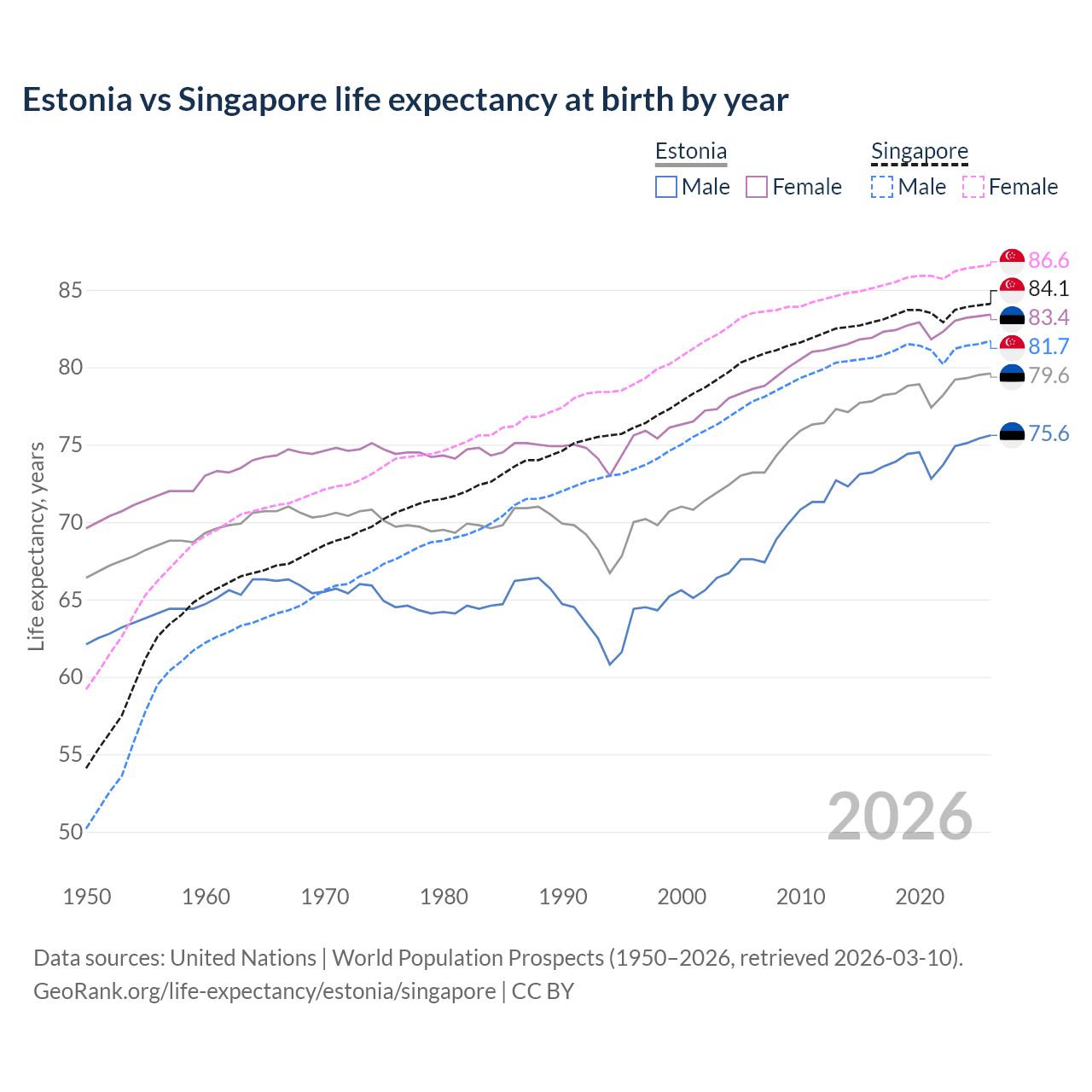 The average life expectancy at birth is 79.6 years in Estonia vs 84.1 in Singapore. Estonia is ranked 48/197 by life expectancy, and Singapore is 9/197. In Estonia, the life expectancy is 75.6 years for males and 83.4 years for females. In Singapore, it's 81.7 years for males and 86.6 years for females.