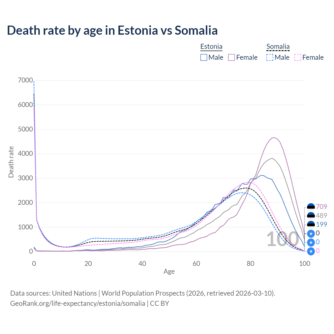 This life expectancy calculator shows the odds of living to 100, 95, 90, and below based on current age for both males and females in Estonia and Somalia, along with mean and median age of death. The calculations are based on the 2026 life tables (actuarial tables) from the UN World Population Prospects.