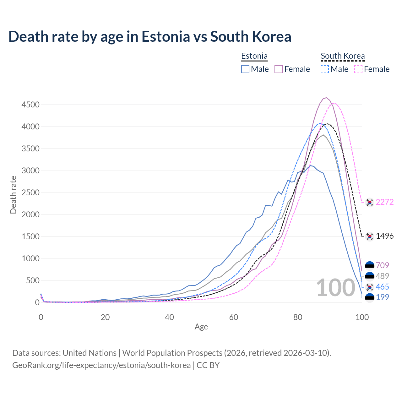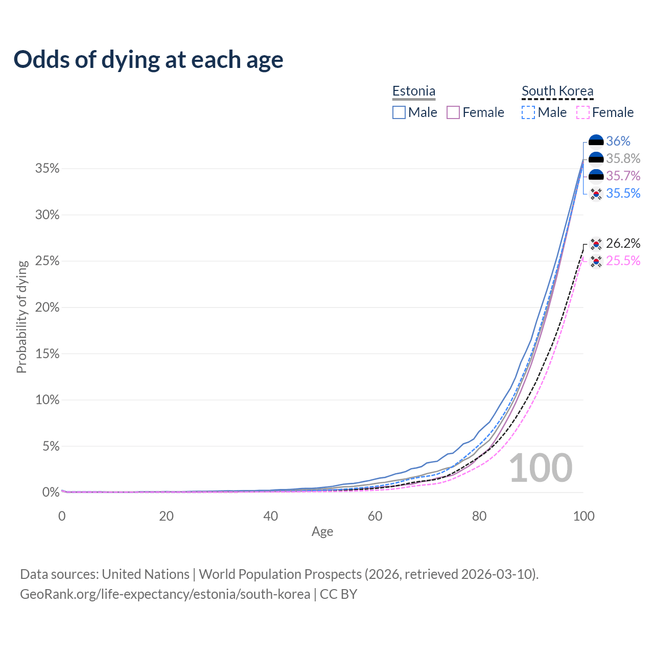 This life expectancy calculator shows the odds of living to 100, 95, 90, and below based on current age for both males and females in Estonia and South Korea, along with mean and median age of death. The calculations are based on the 2026 life tables (actuarial tables) from the UN World Population Prospects.