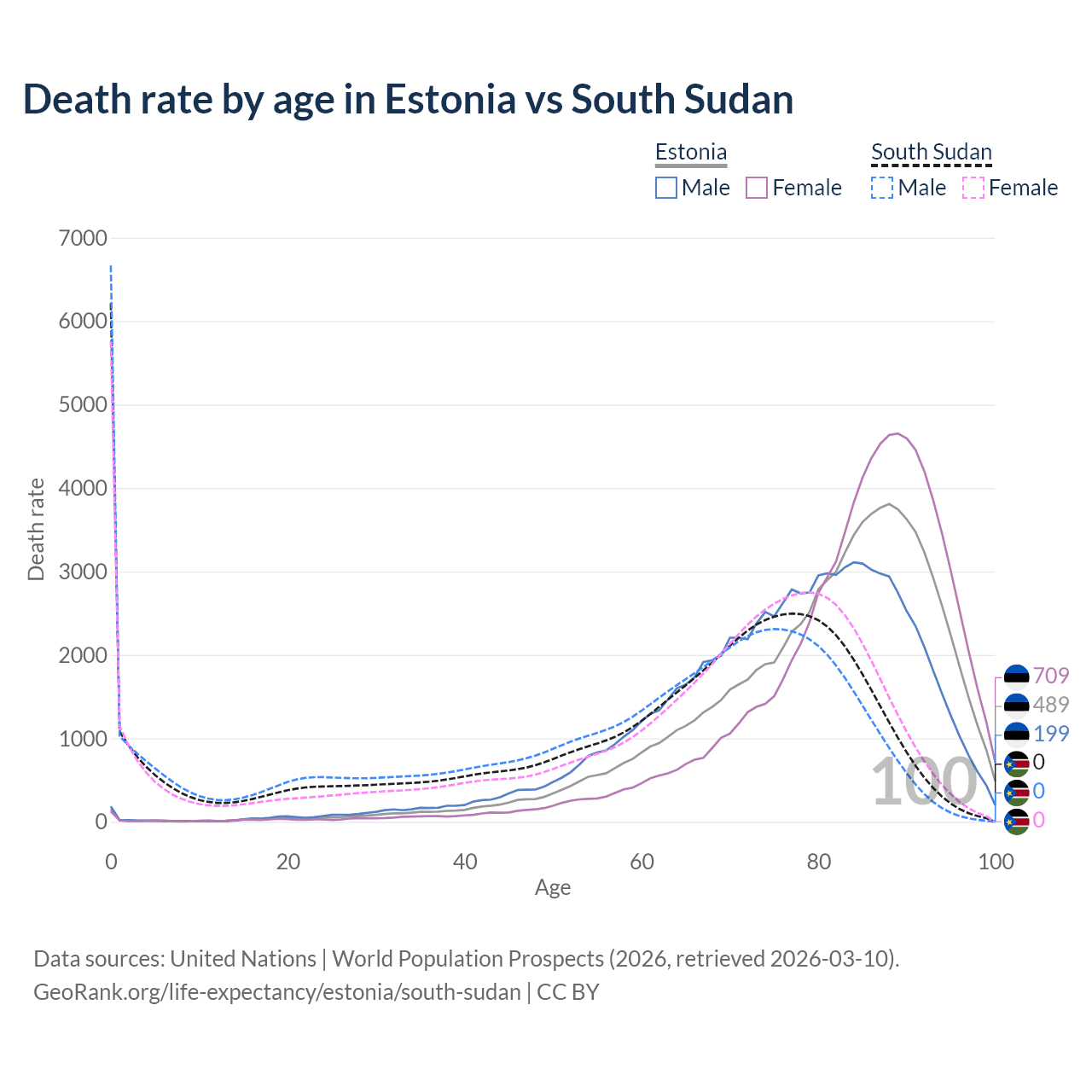 In Estonia, the most common age of death is 88, compared to 0 in South Sudan. The median age of death is 83.1 in Estonia and 67.5 in South Sudan, meaning only half of each cohort is expected to live past that age.