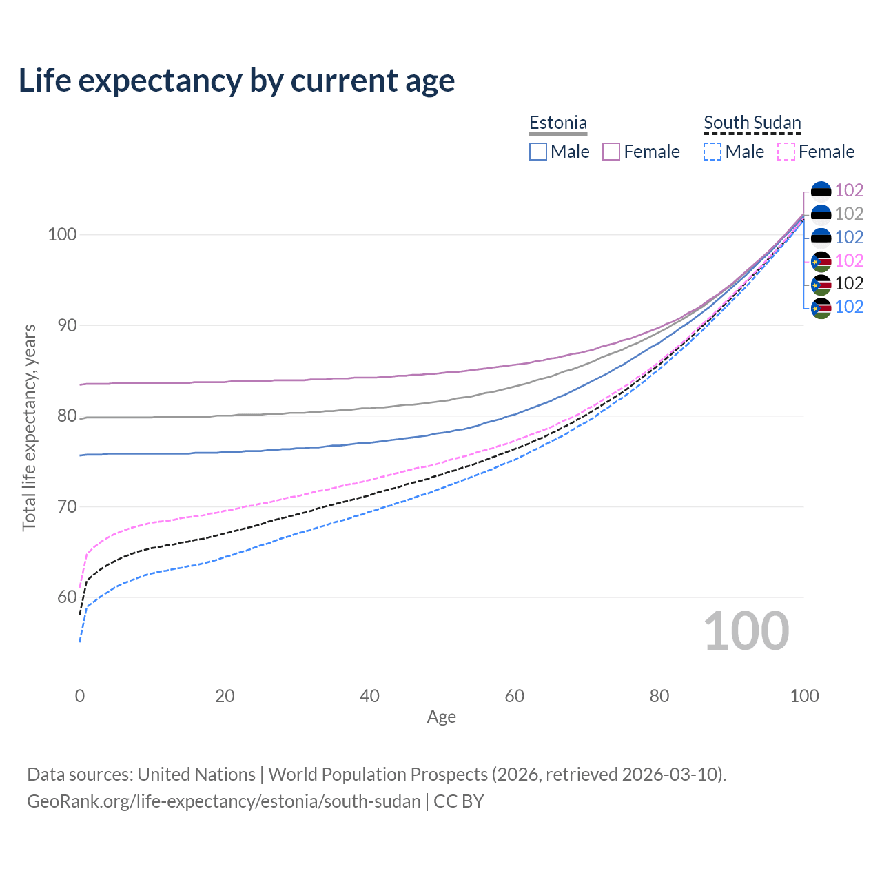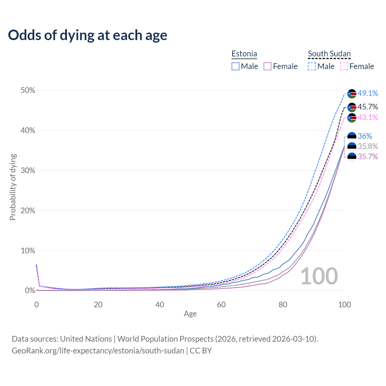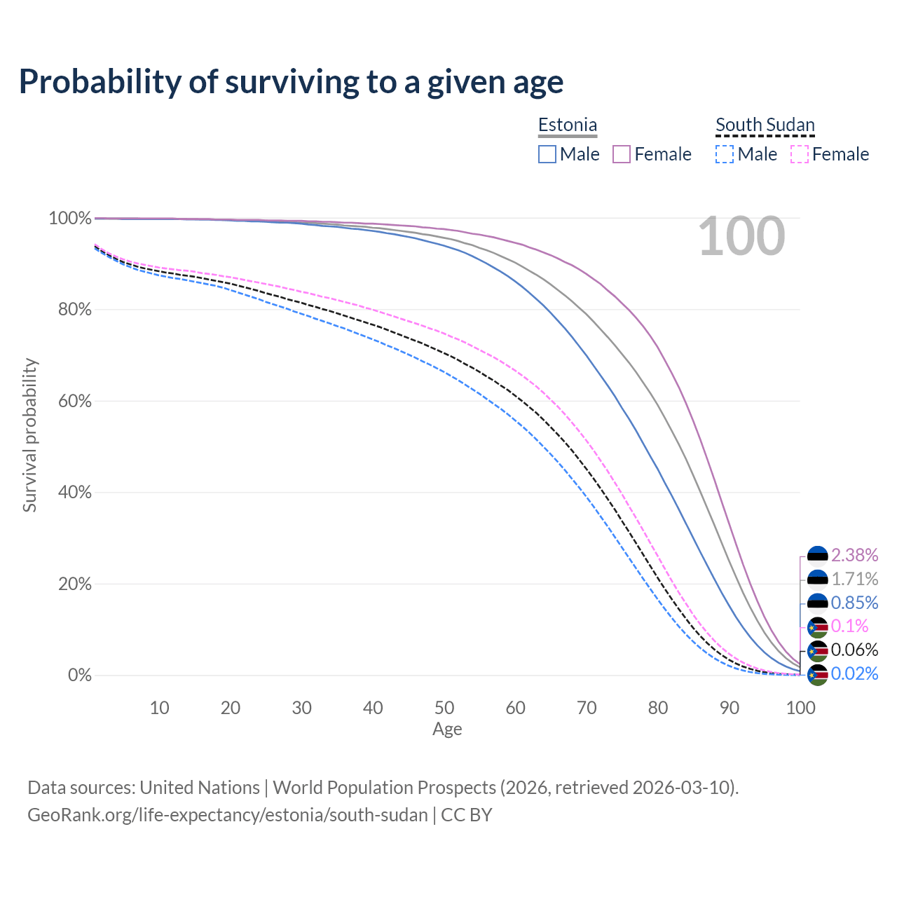 This life expectancy calculator shows the odds of living to 100, 95, 90, and below based on current age for both males and females in Estonia and South Sudan, along with mean and median age of death. The calculations are based on the 2026 life tables (actuarial tables) from the UN World Population Prospects.