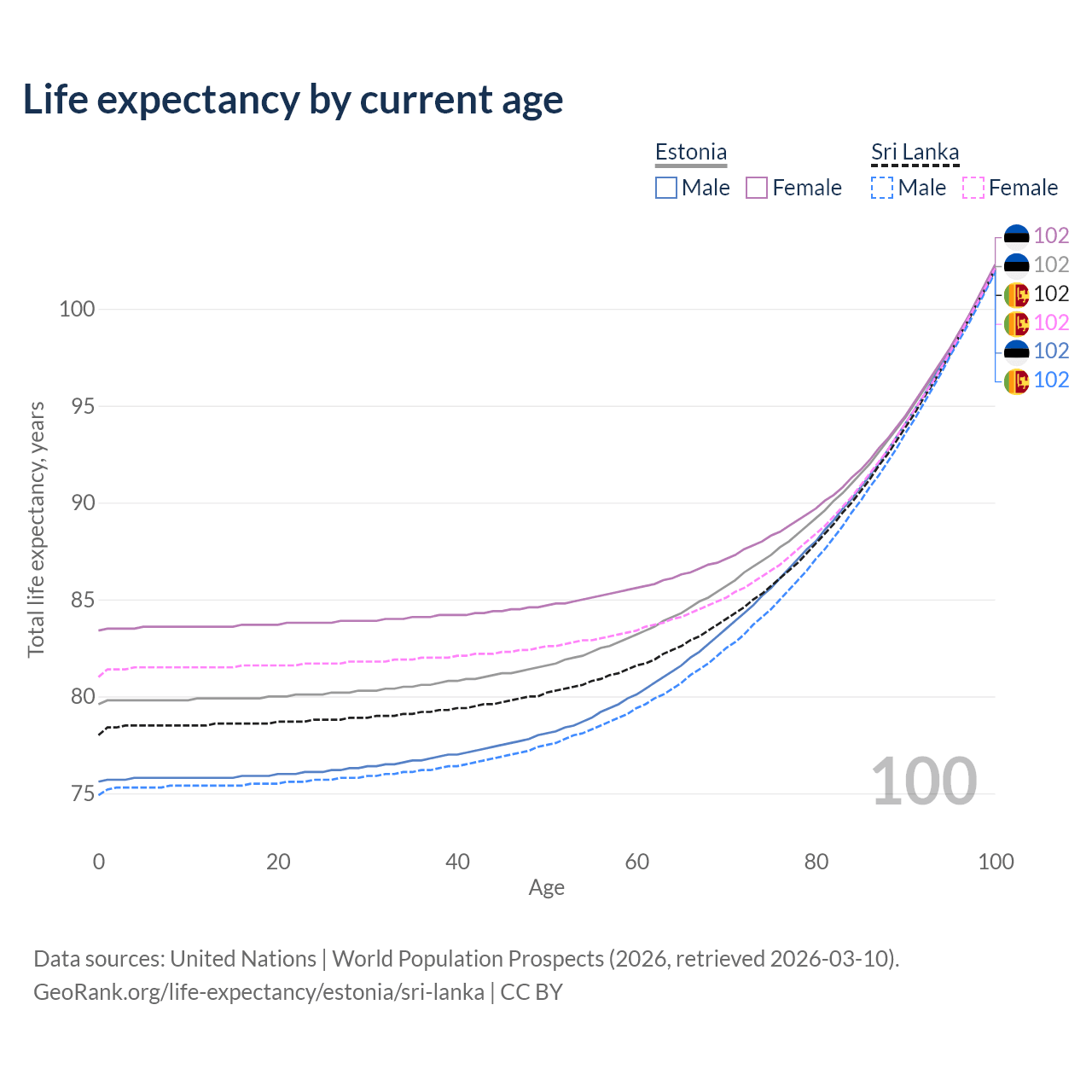 This life expectancy calculator shows the odds of living to 100, 95, 90, and below based on current age for both males and females in Estonia and Sri Lanka, along with mean and median age of death. The calculations are based on the 2026 life tables (actuarial tables) from the UN World Population Prospects.