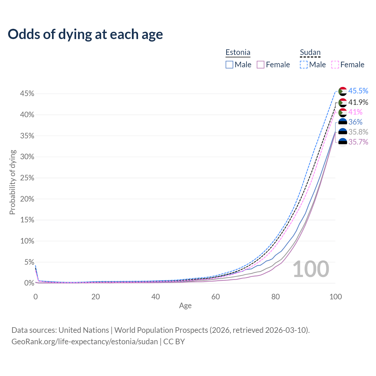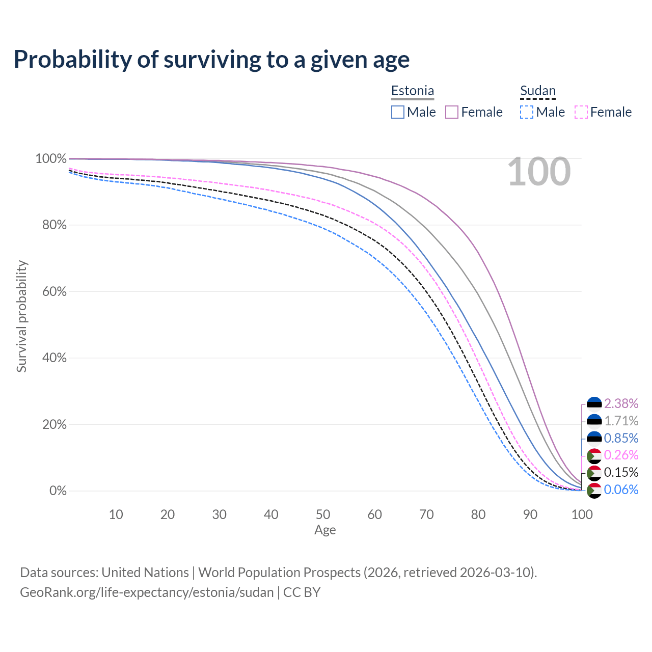 This life expectancy calculator shows the odds of living to 100, 95, 90, and below based on current age for both males and females in Estonia and Sudan, along with mean and median age of death. The calculations are based on the 2026 life tables (actuarial tables) from the UN World Population Prospects.