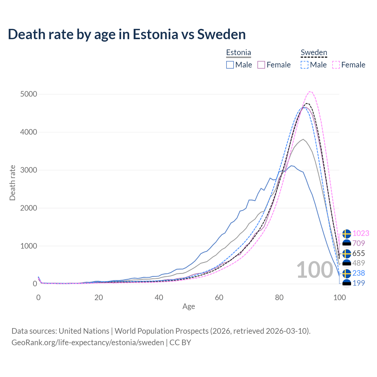 In Estonia, the most common age of death is 88, compared to 89 in Sweden. The median age of death is 83.1 in Estonia and 86.5 in Sweden, meaning only half of each cohort is expected to live past that age.