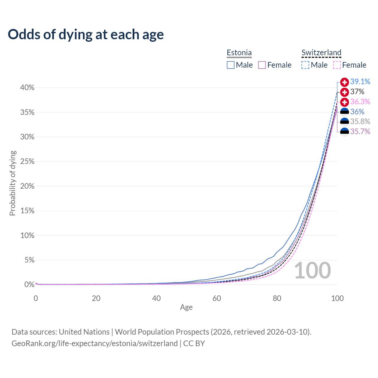 This life expectancy calculator shows the odds of living to 100, 95, 90, and below based on current age for both males and females in Estonia and Switzerland, along with mean and median age of death. The calculations are based on the 2026 life tables (actuarial tables) from the UN World Population Prospects.