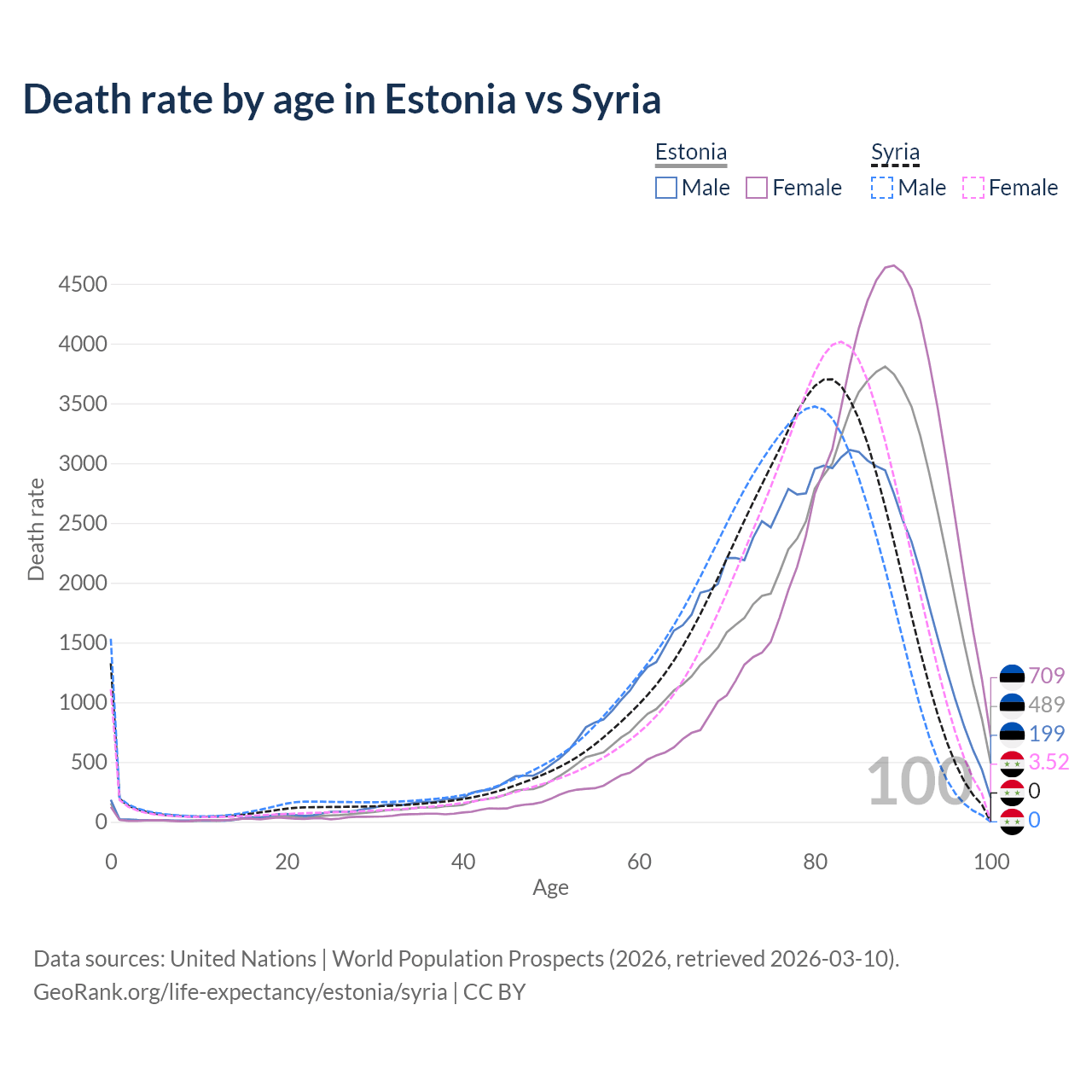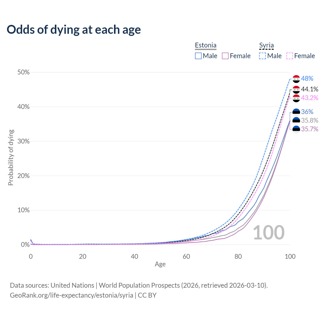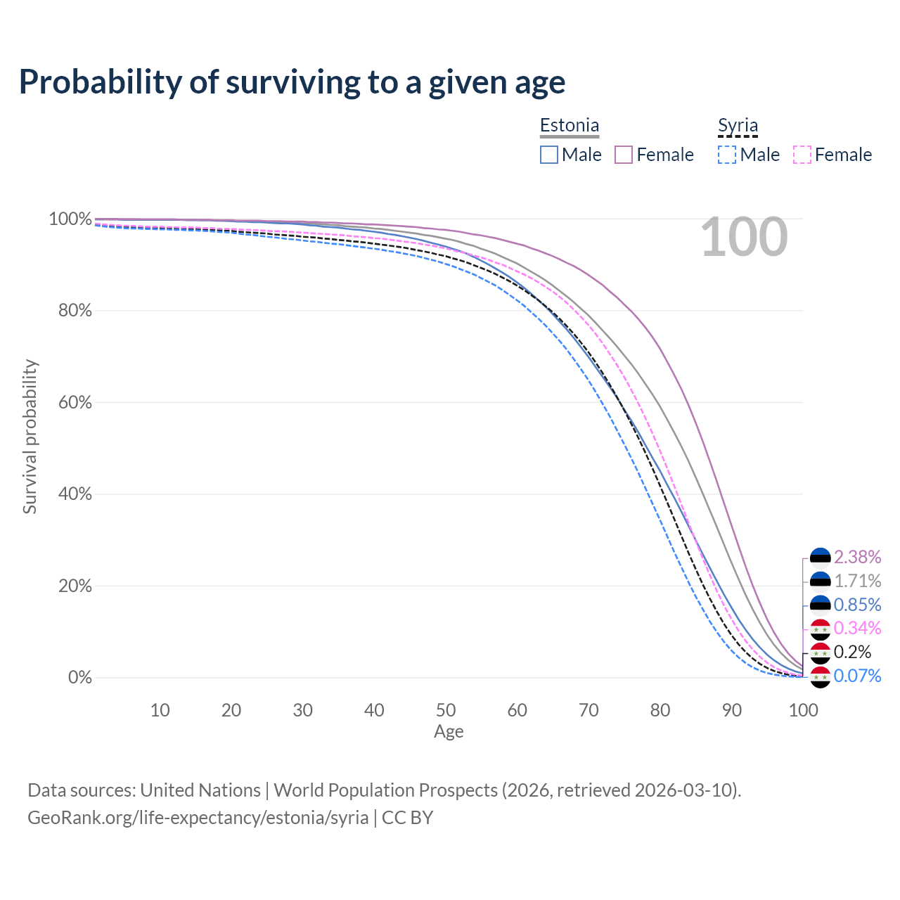This life expectancy calculator shows the odds of living to 100, 95, 90, and below based on current age for both males and females in Estonia and Syria, along with mean and median age of death. The calculations are based on the 2026 life tables (actuarial tables) from the UN World Population Prospects.