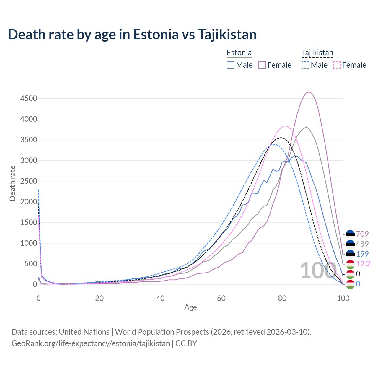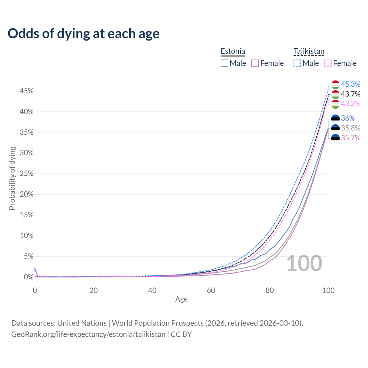 This life expectancy calculator shows the odds of living to 100, 95, 90, and below based on current age for both males and females in Estonia and Tajikistan, along with mean and median age of death. The calculations are based on the 2026 life tables (actuarial tables) from the UN World Population Prospects.