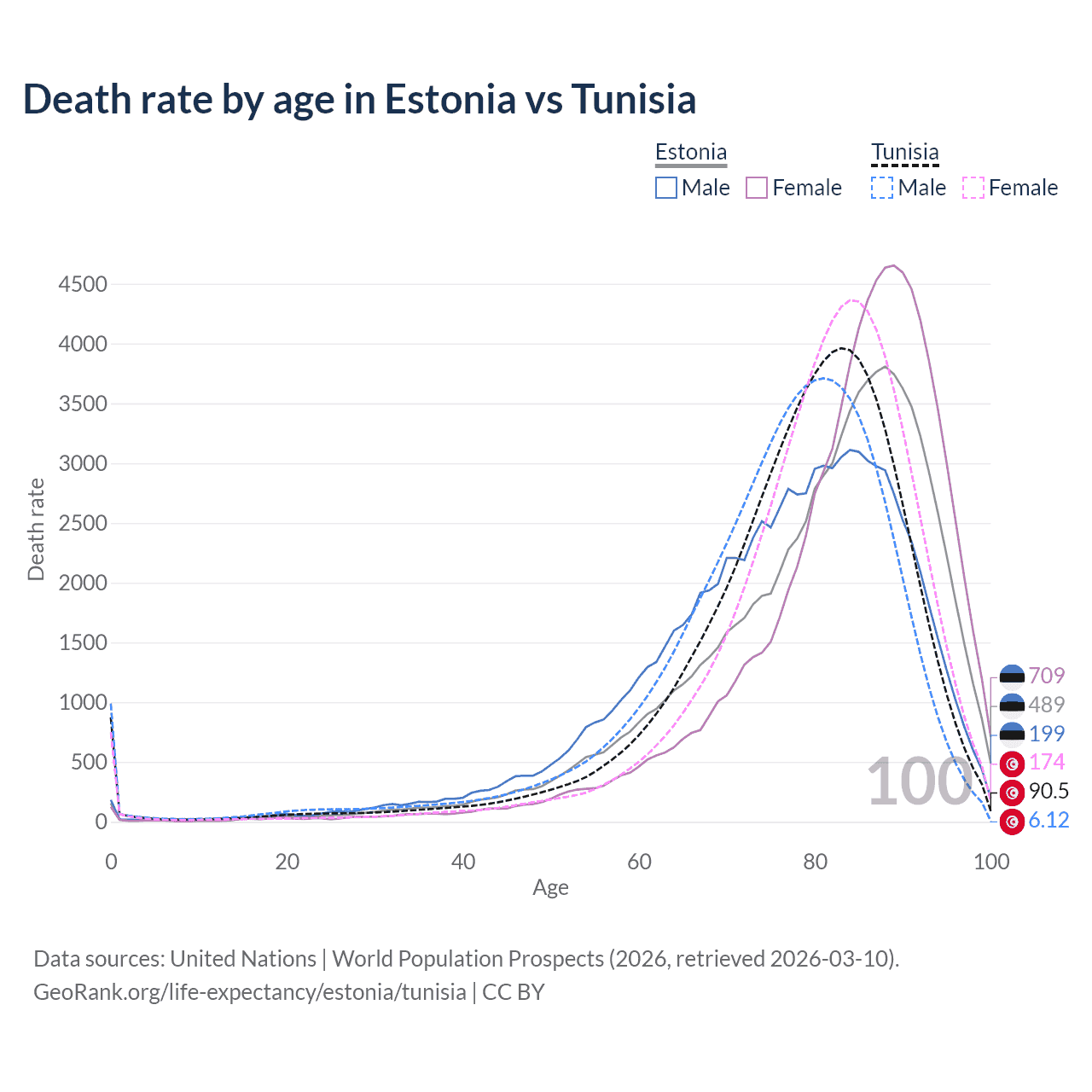 In Estonia, the most common age of death is 88, compared to 83 in Tunisia. The median age of death is 83.1 in Estonia and 80.2 in Tunisia, meaning only half of each cohort is expected to live past that age.
