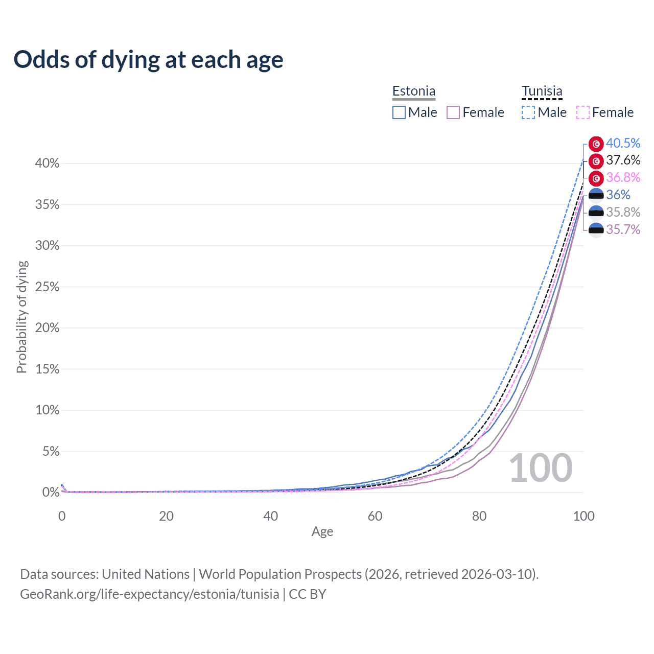This life expectancy calculator shows the odds of living to 100, 95, 90, and below based on current age for both males and females in Estonia and Tunisia, along with mean and median age of death. The calculations are based on the 2026 life tables (actuarial tables) from the UN World Population Prospects.