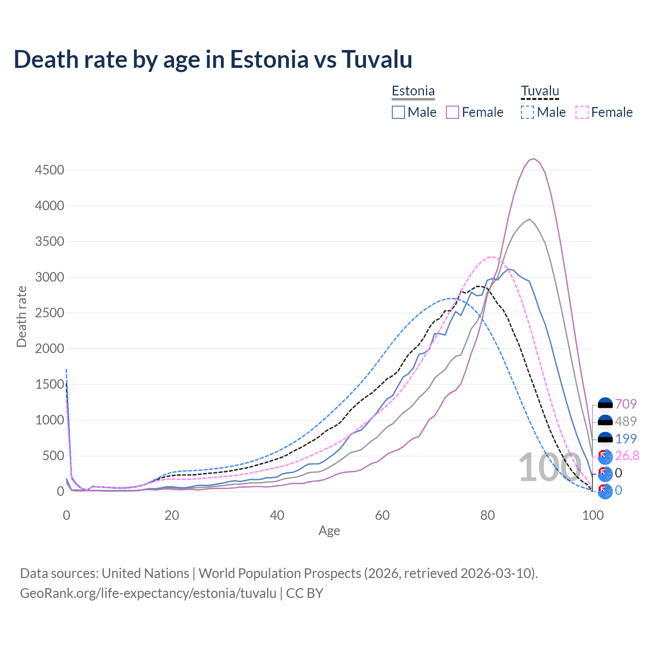 In Estonia, the most common age of death is 88, compared to 78 in Tuvalu. The median age of death is 83.1 in Estonia and 71.9 in Tuvalu, meaning only half of each cohort is expected to live past that age.