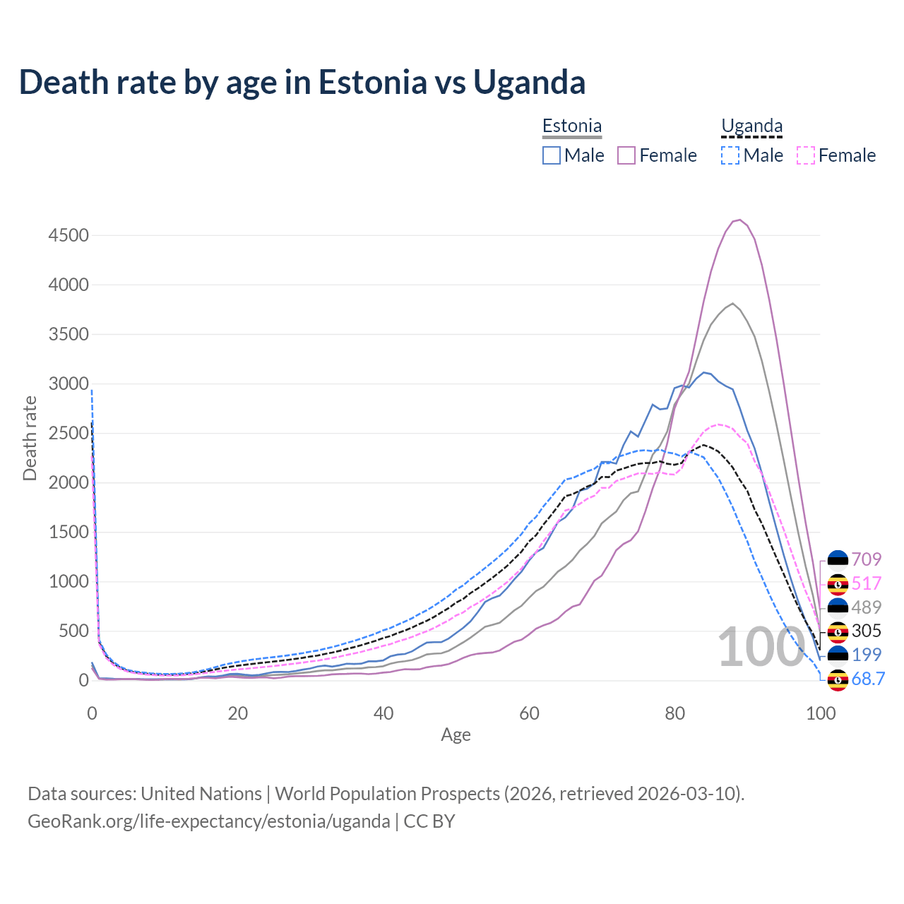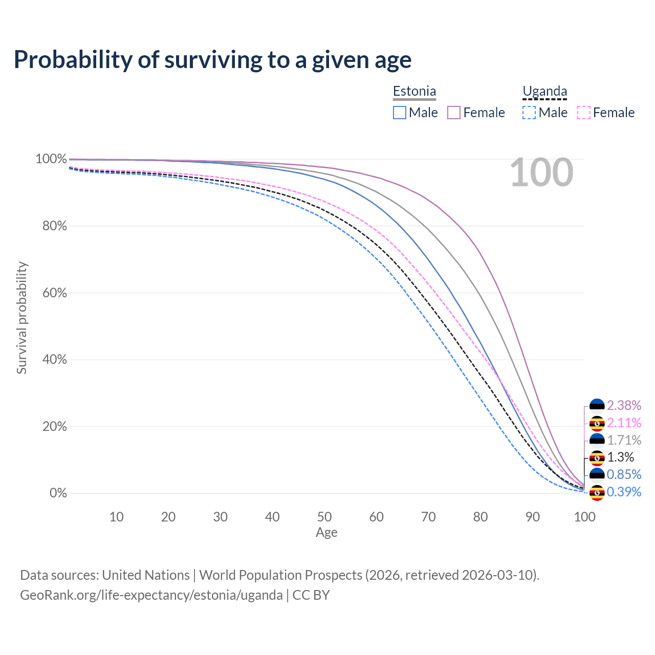This life expectancy calculator shows the odds of living to 100, 95, 90, and below based on current age for both males and females in Estonia and Uganda, along with mean and median age of death. The calculations are based on the 2026 life tables (actuarial tables) from the UN World Population Prospects.