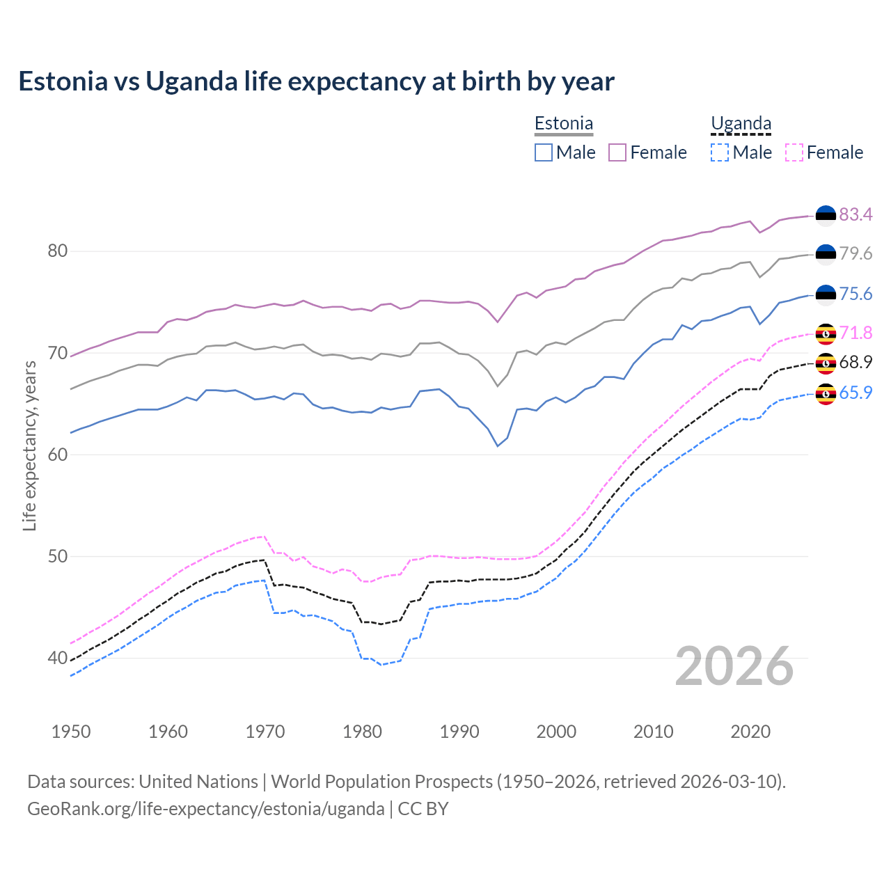 The average life expectancy at birth is 79.6 years in Estonia vs 68.9 in Uganda. Estonia is ranked 48/197 by life expectancy, and Uganda is 146/197. In Estonia, the life expectancy is 75.6 years for males and 83.4 years for females. In Uganda, it's 65.9 years for males and 71.8 years for females.