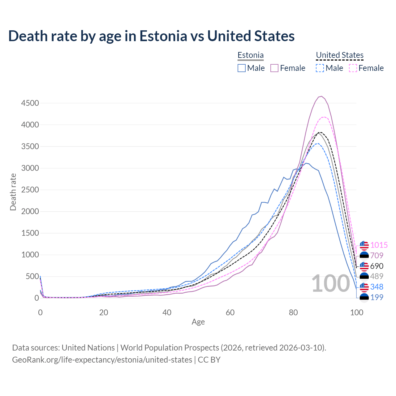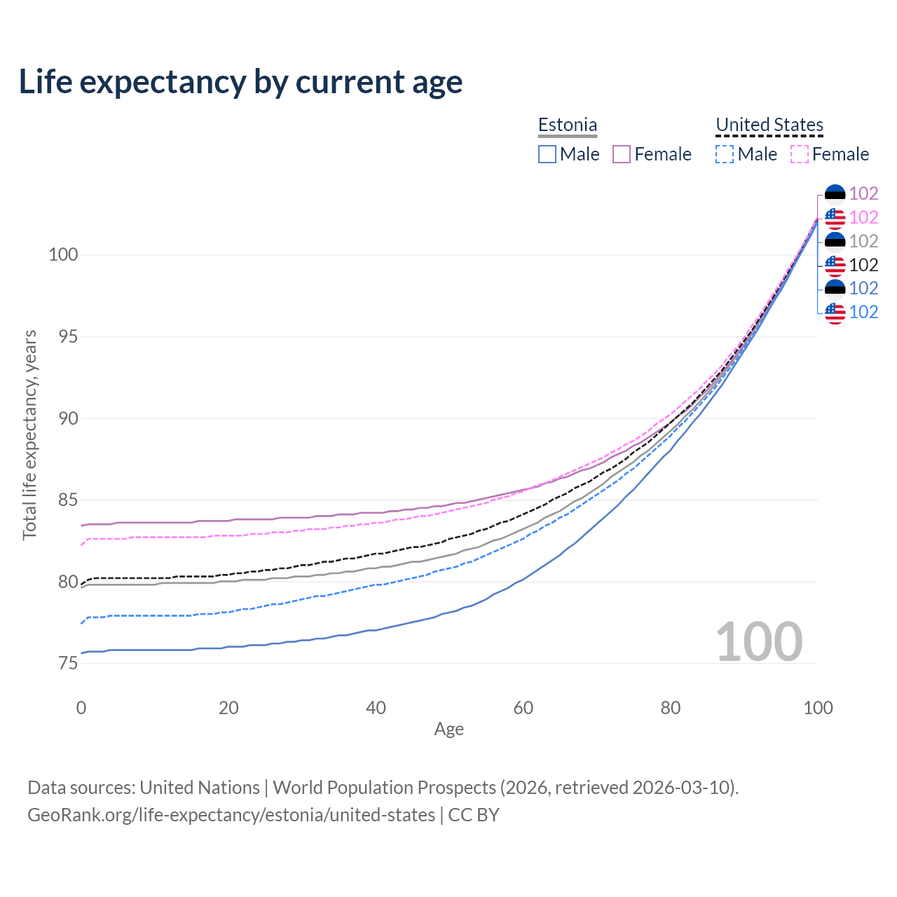 This life expectancy calculator shows the odds of living to 100, 95, 90, and below based on current age for both males and females in Estonia and the United States, along with mean and median age of death. The calculations are based on the 2026 life tables (actuarial tables) from the UN World Population Prospects.