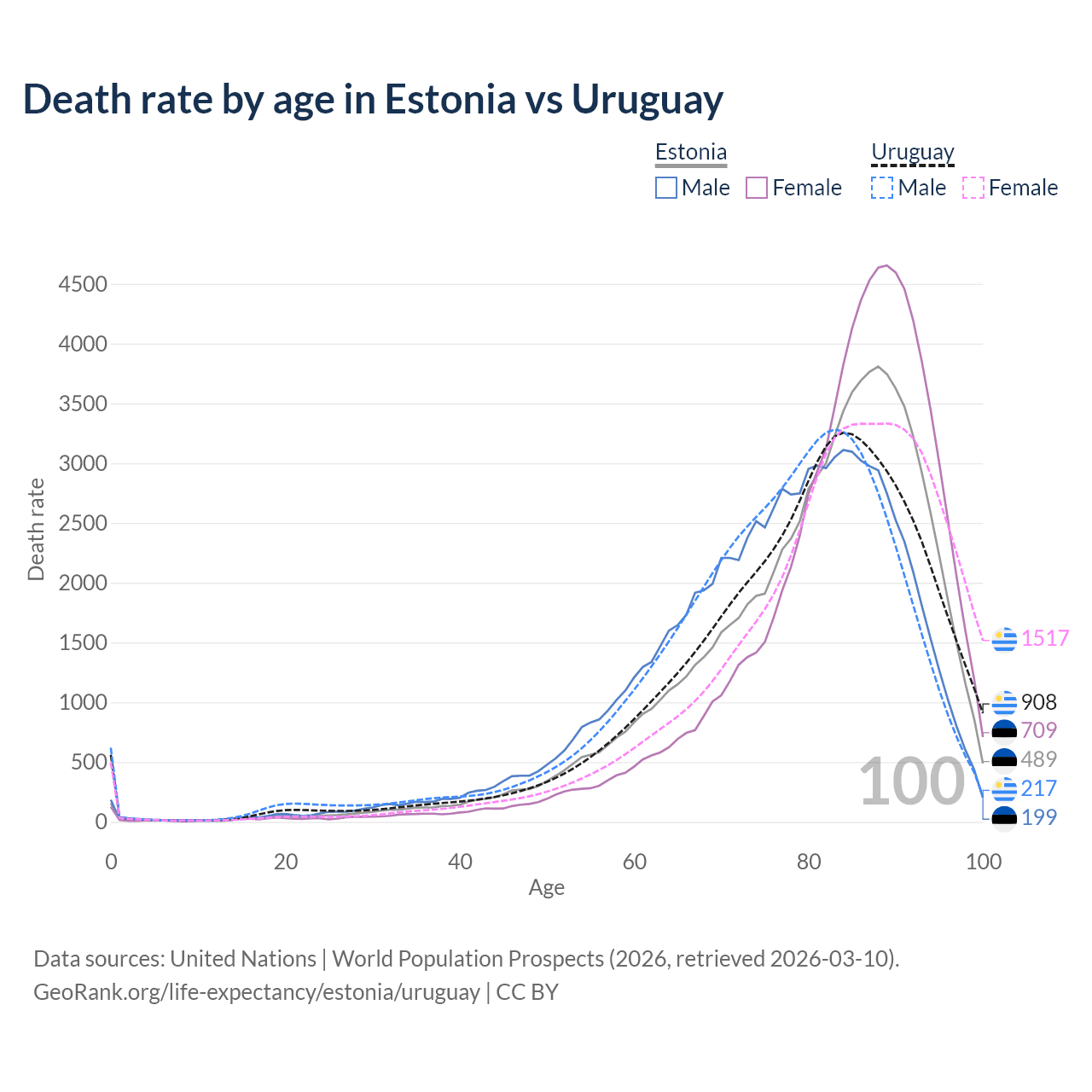This life expectancy calculator shows the odds of living to 100, 95, 90, and below based on current age for both males and females in Estonia and Uruguay, along with mean and median age of death. The calculations are based on the 2026 life tables (actuarial tables) from the UN World Population Prospects.