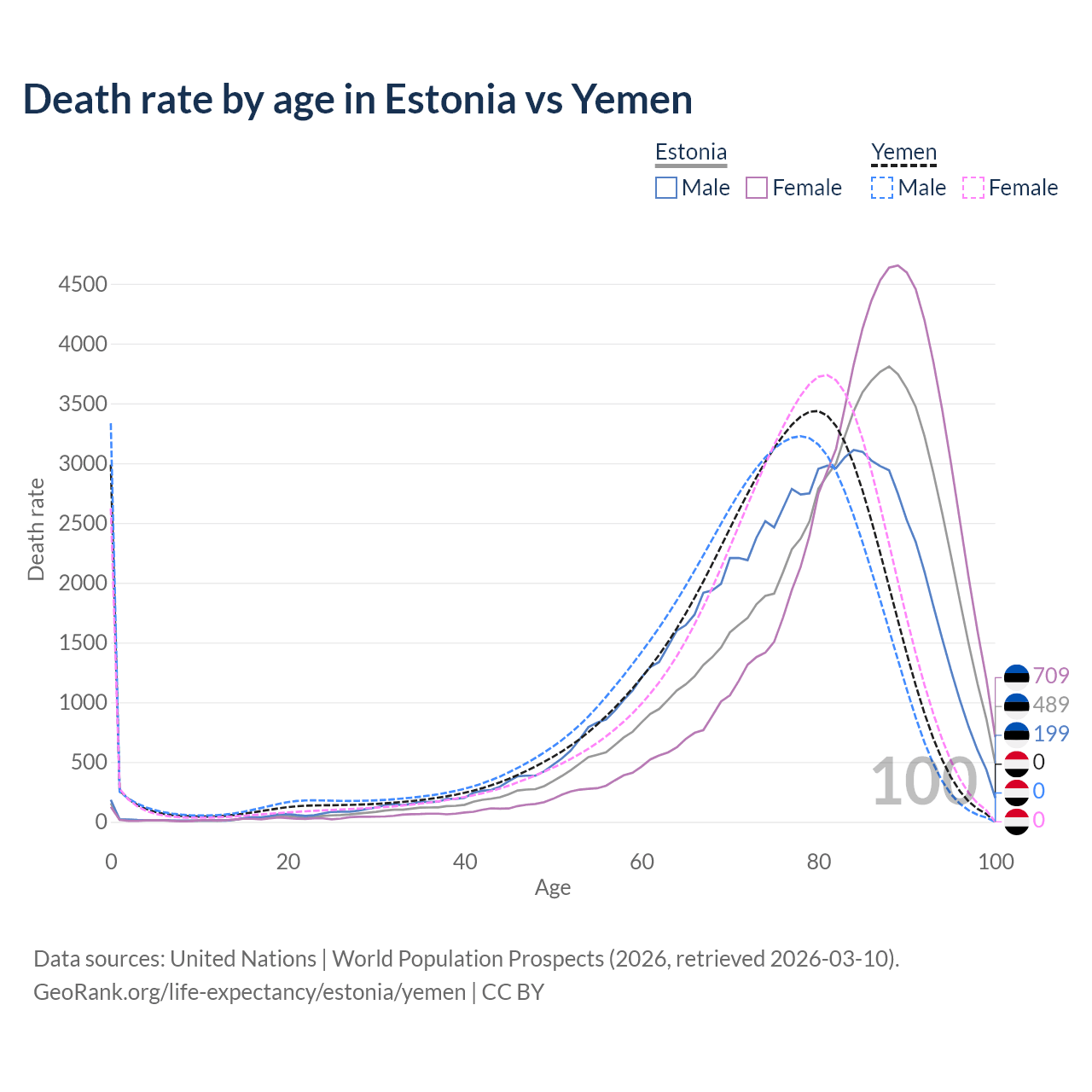 In Estonia, the most common age of death is 88, compared to 80 in Yemen. The median age of death is 83.1 in Estonia and 74.9 in Yemen, meaning only half of each cohort is expected to live past that age.