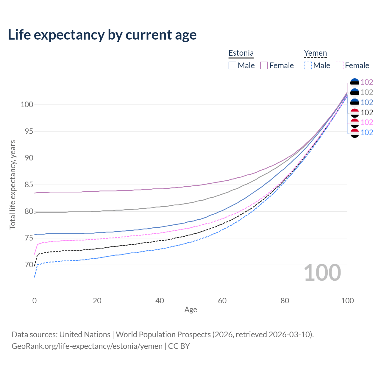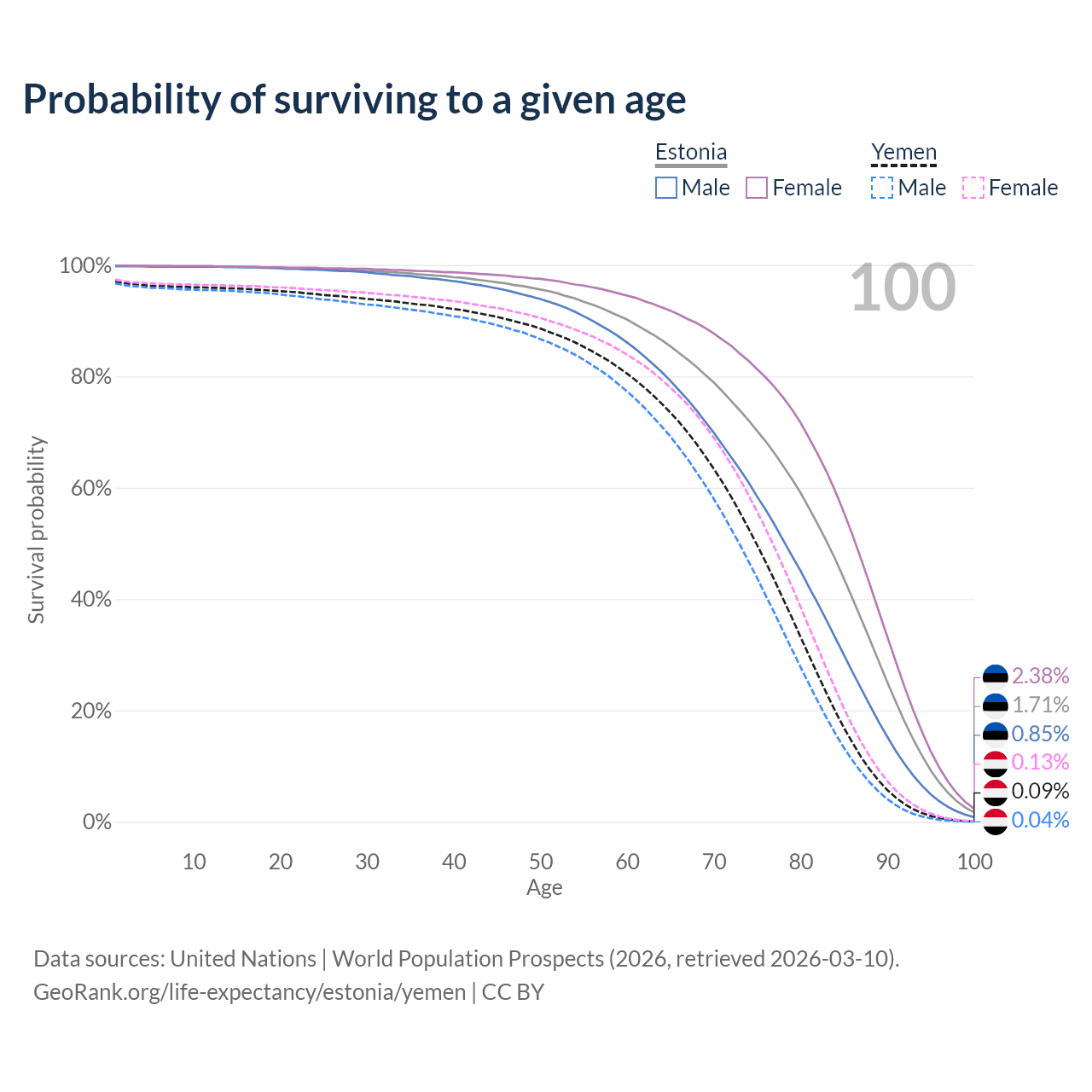 This life expectancy calculator shows the odds of living to 100, 95, 90, and below based on current age for both males and females in Estonia and Yemen, along with mean and median age of death. The calculations are based on the 2026 life tables (actuarial tables) from the UN World Population Prospects.