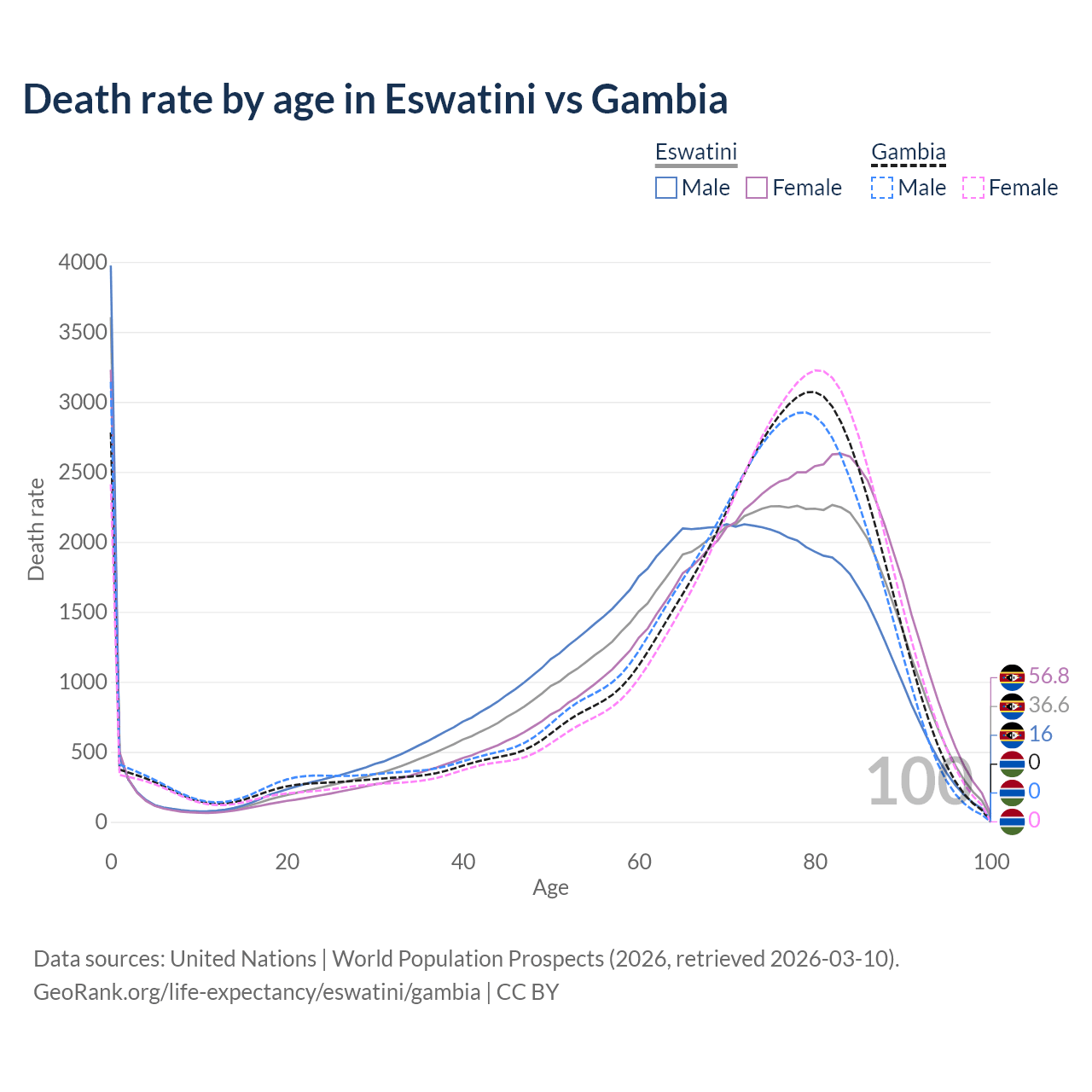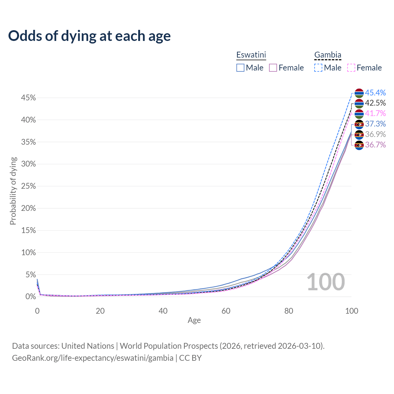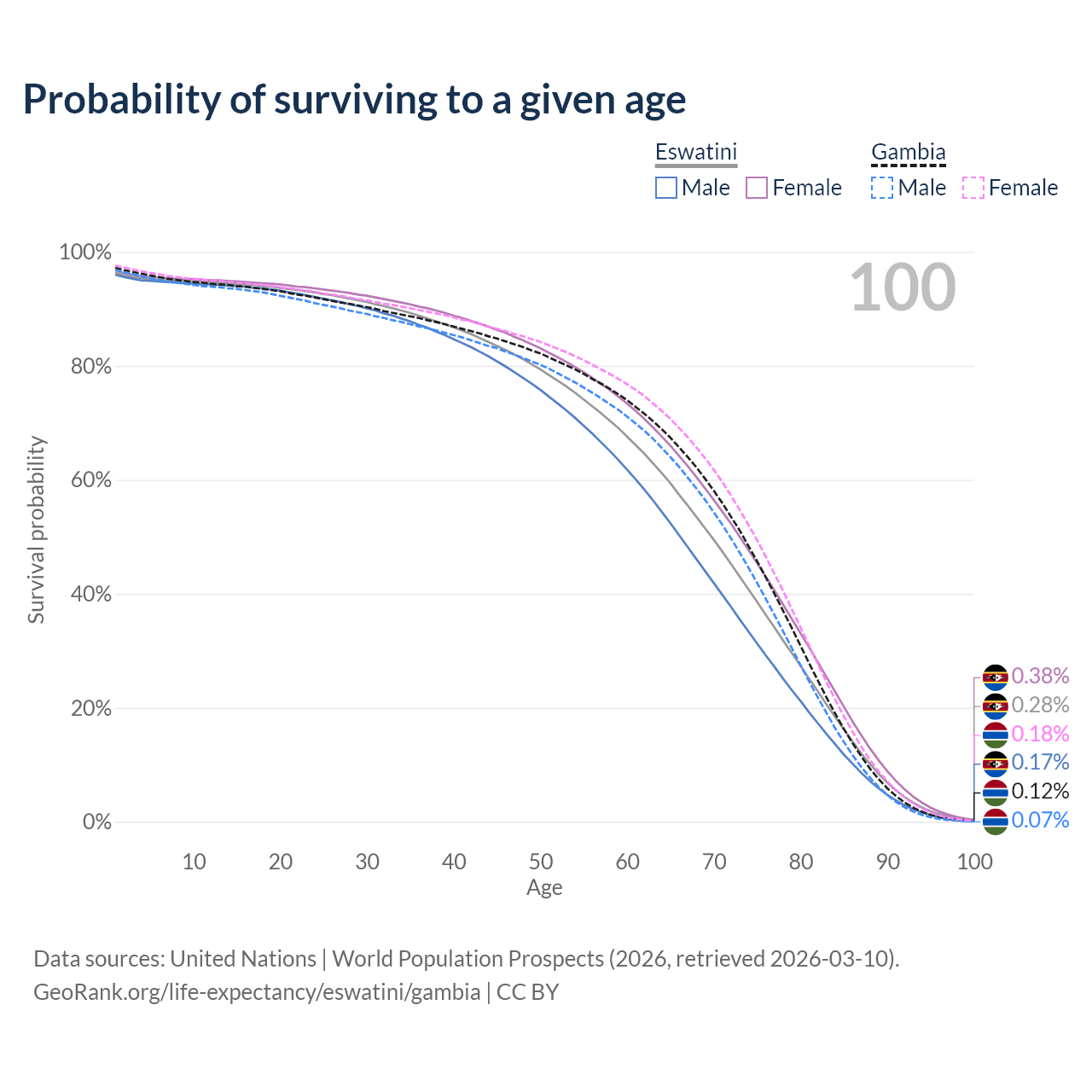 This life expectancy calculator shows the odds of living to 100, 95, 90, and below based on current age for both males and females in Eswatini and the Gambia, along with mean and median age of death. The calculations are based on the 2026 life tables (actuarial tables) from the UN World Population Prospects.