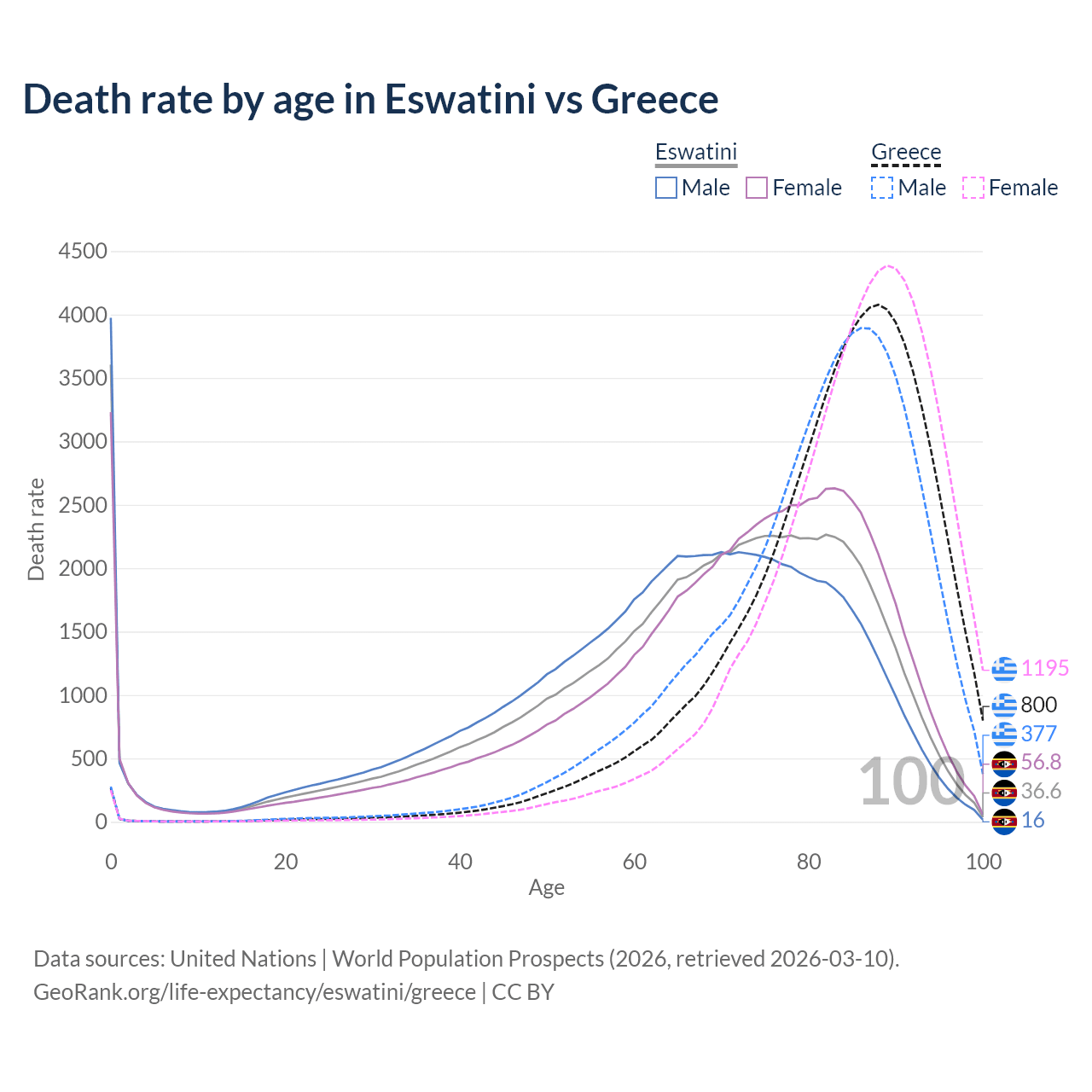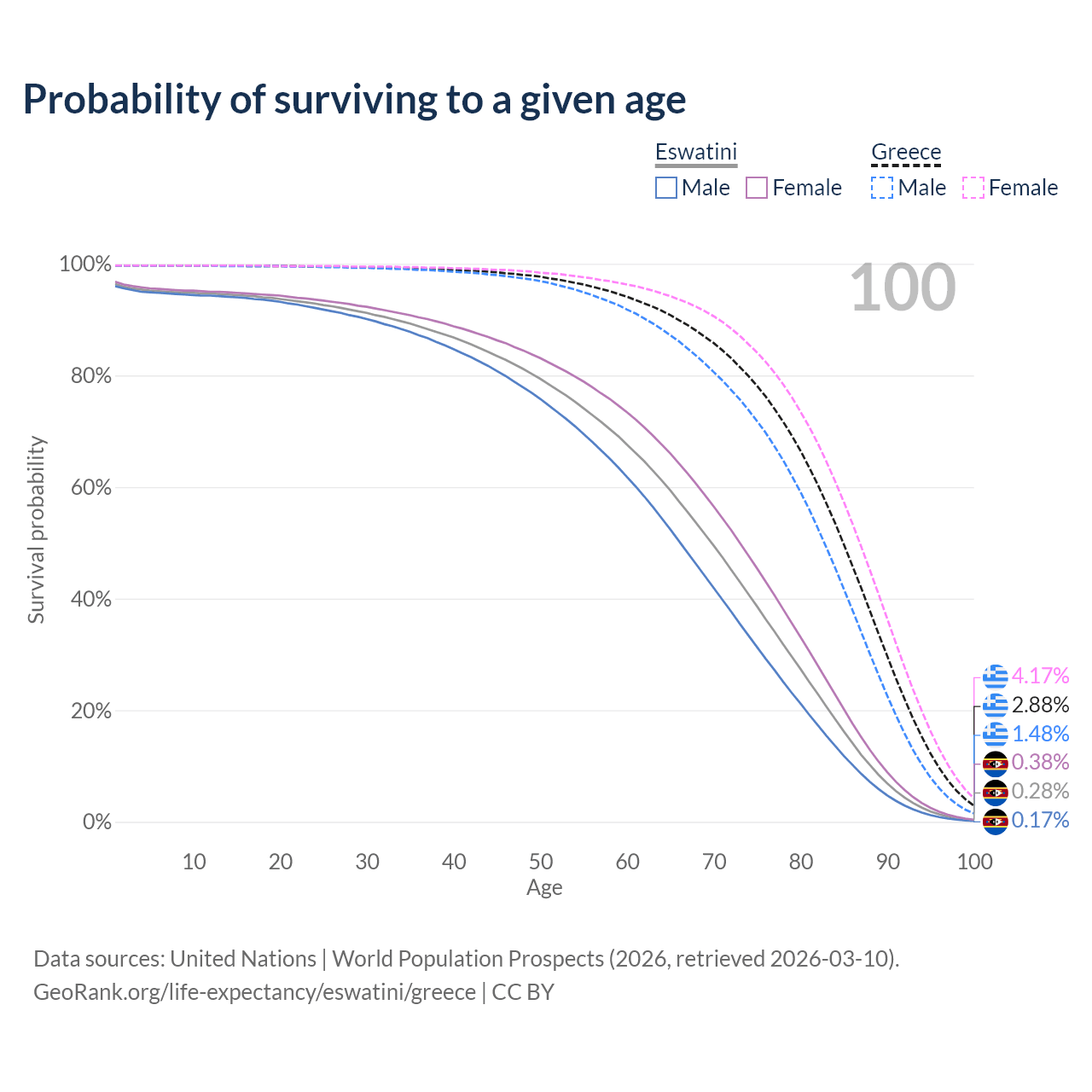 This life expectancy calculator shows the odds of living to 100, 95, 90, and below based on current age for both males and females in Eswatini and Greece, along with mean and median age of death. The calculations are based on the 2026 life tables (actuarial tables) from the UN World Population Prospects.