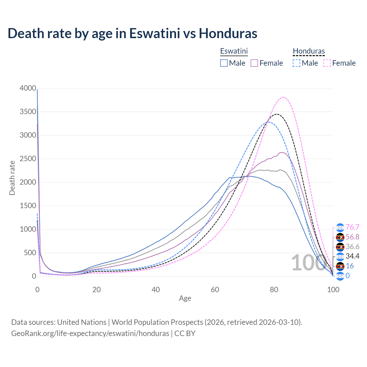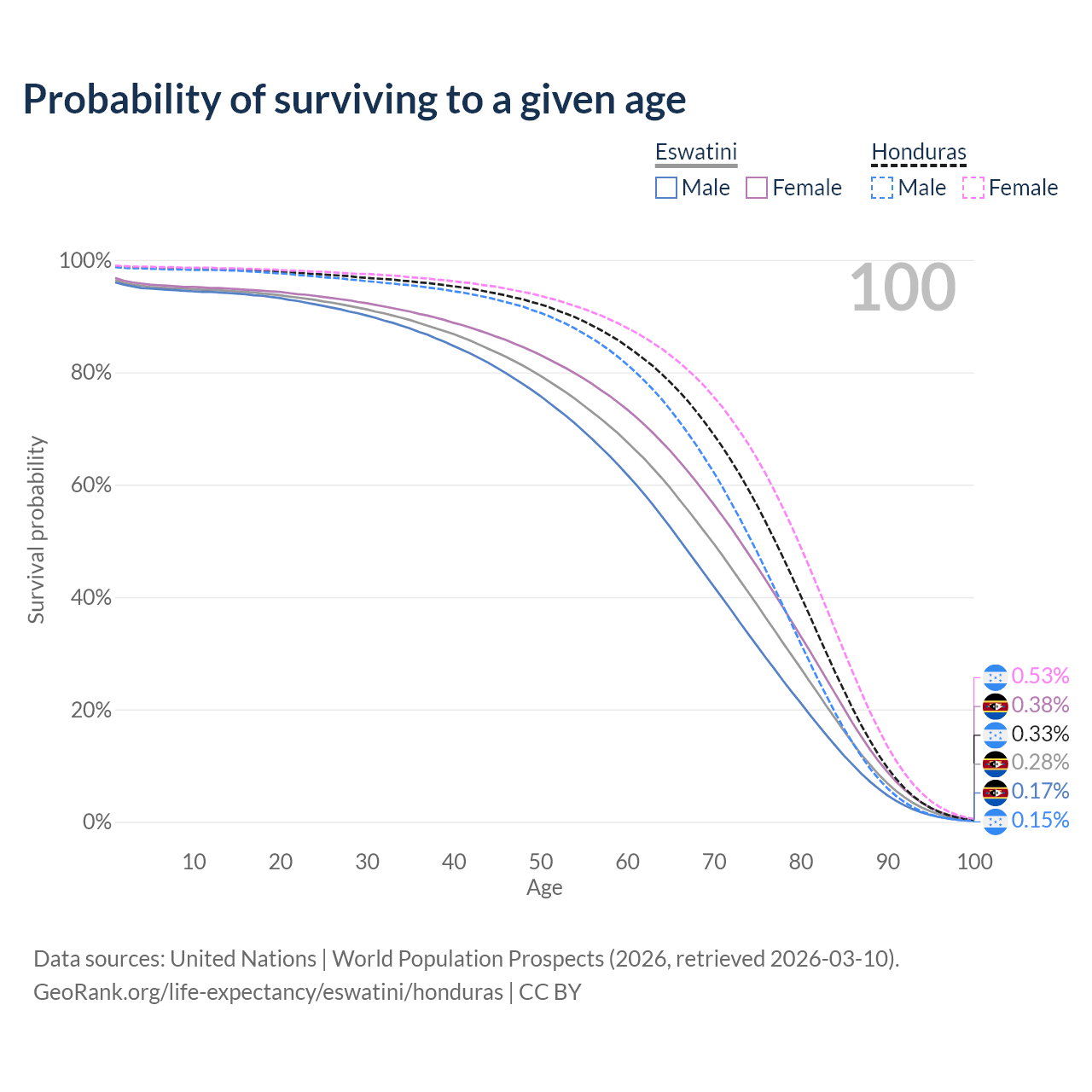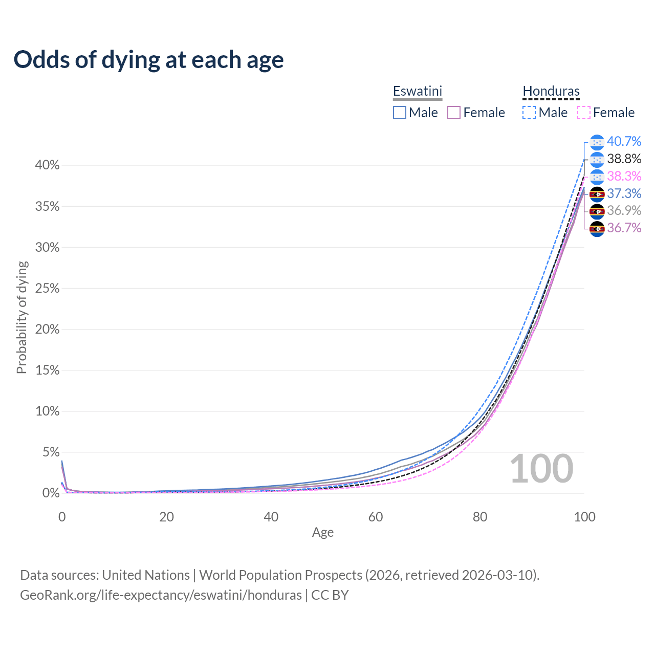 This life expectancy calculator shows the odds of living to 100, 95, 90, and below based on current age for both males and females in Eswatini and Honduras, along with mean and median age of death. The calculations are based on the 2026 life tables (actuarial tables) from the UN World Population Prospects.