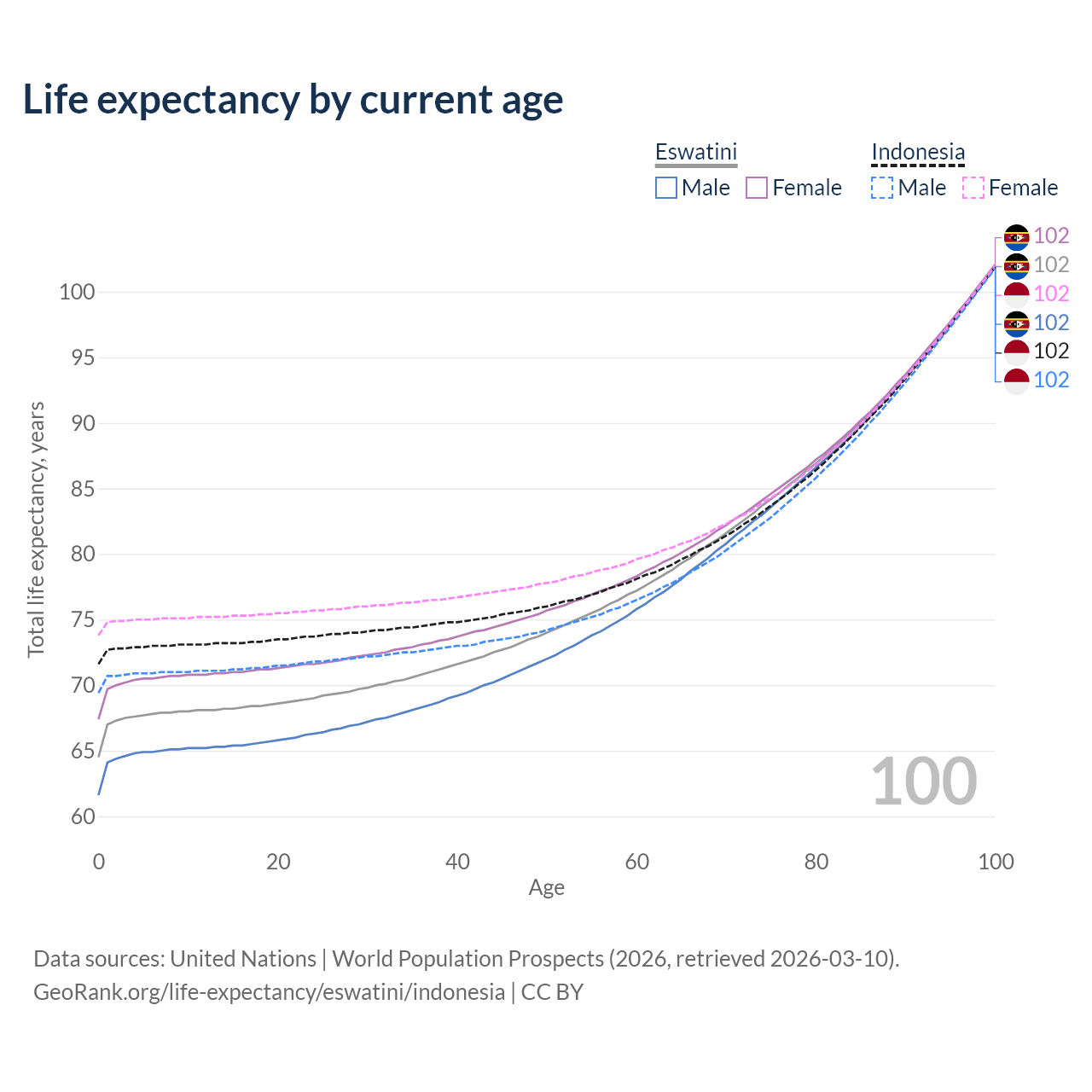This life expectancy calculator shows the odds of living to 100, 95, 90, and below based on current age for both males and females in Eswatini and Indonesia, along with mean and median age of death. The calculations are based on the 2026 life tables (actuarial tables) from the UN World Population Prospects.