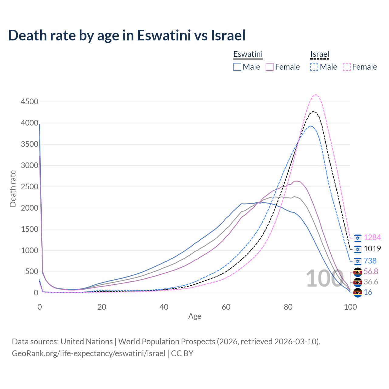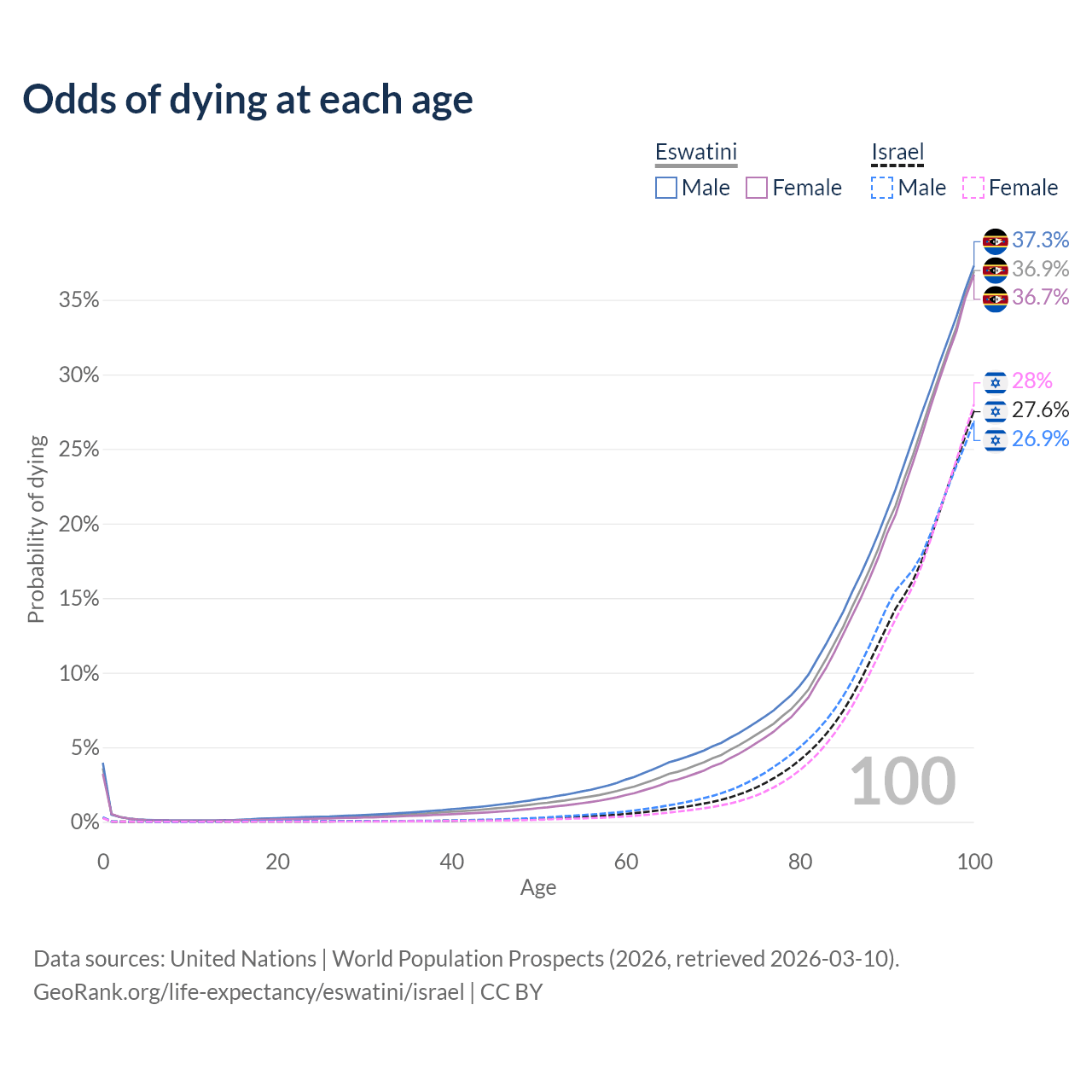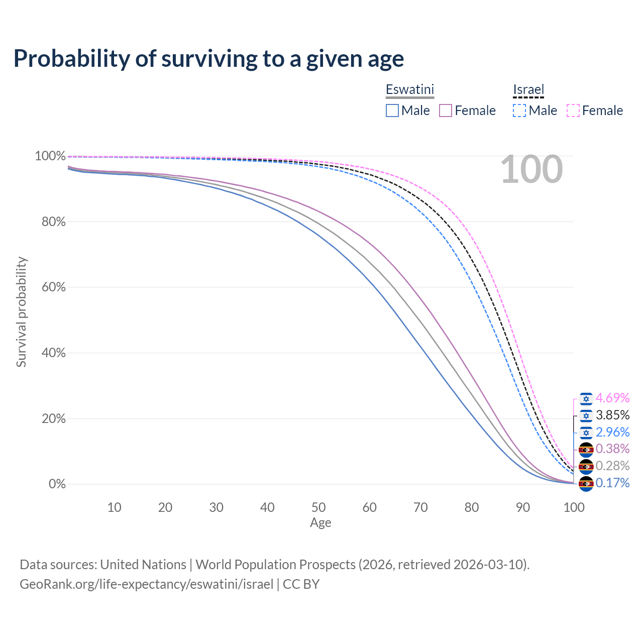 This life expectancy calculator shows the odds of living to 100, 95, 90, and below based on current age for both males and females in Eswatini and Israel, along with mean and median age of death. The calculations are based on the 2026 life tables (actuarial tables) from the UN World Population Prospects.