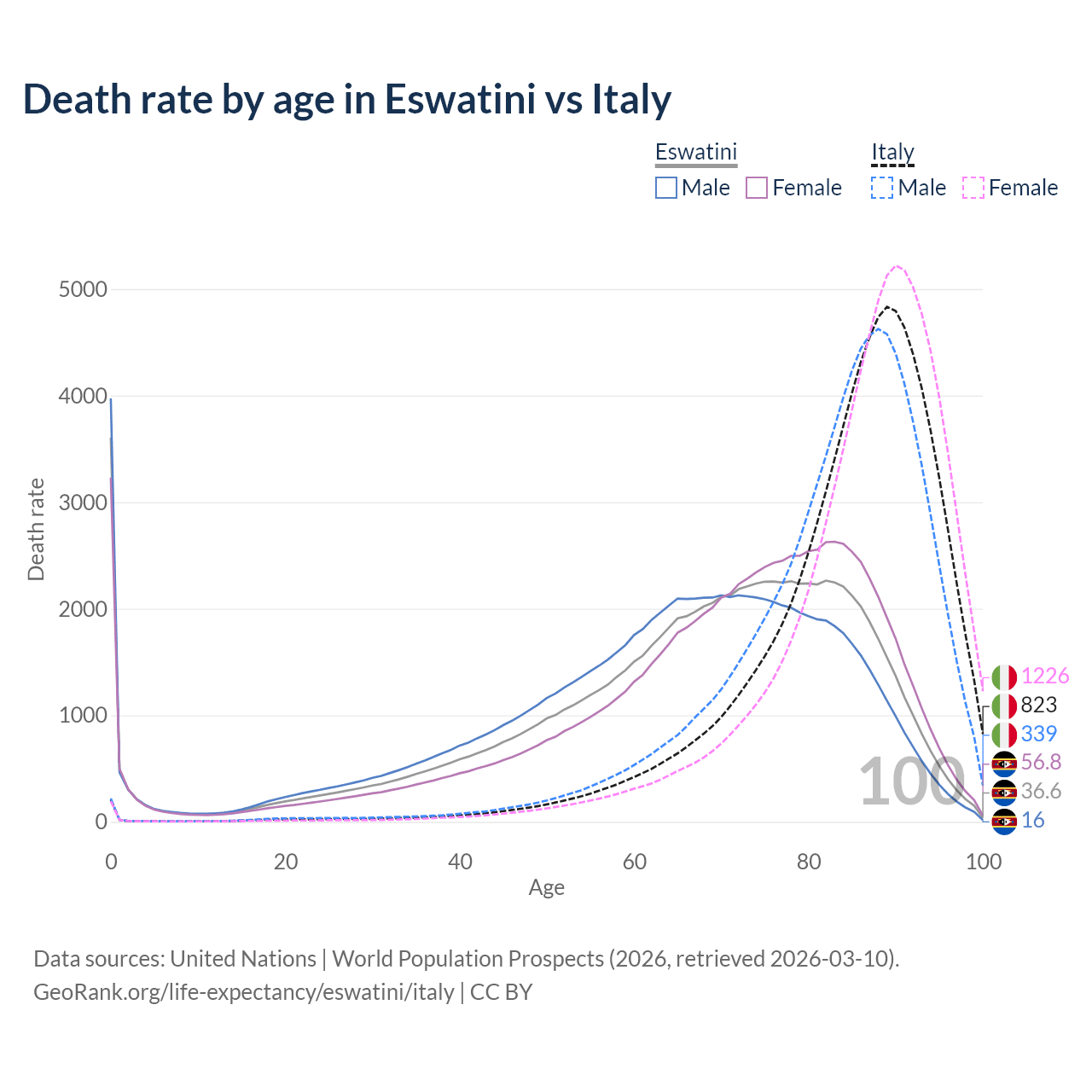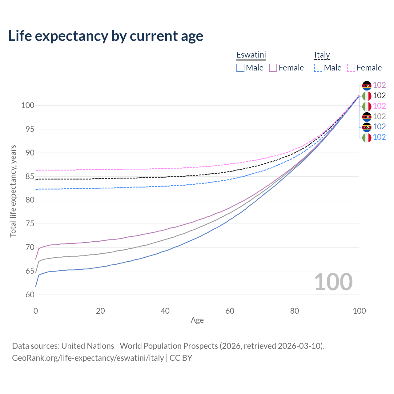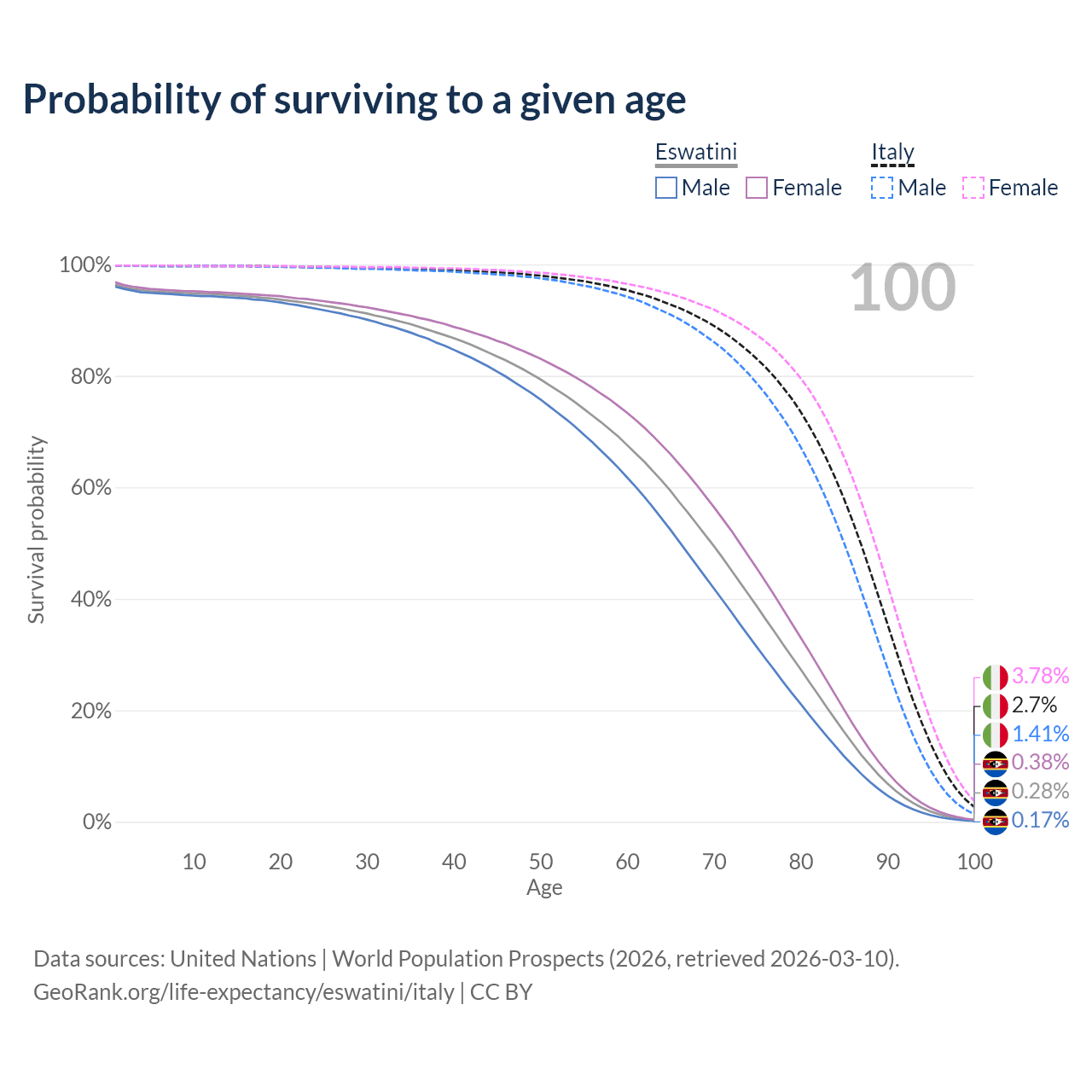 This life expectancy calculator shows the odds of living to 100, 95, 90, and below based on current age for both males and females in Eswatini and Italy, along with mean and median age of death. The calculations are based on the 2026 life tables (actuarial tables) from the UN World Population Prospects.