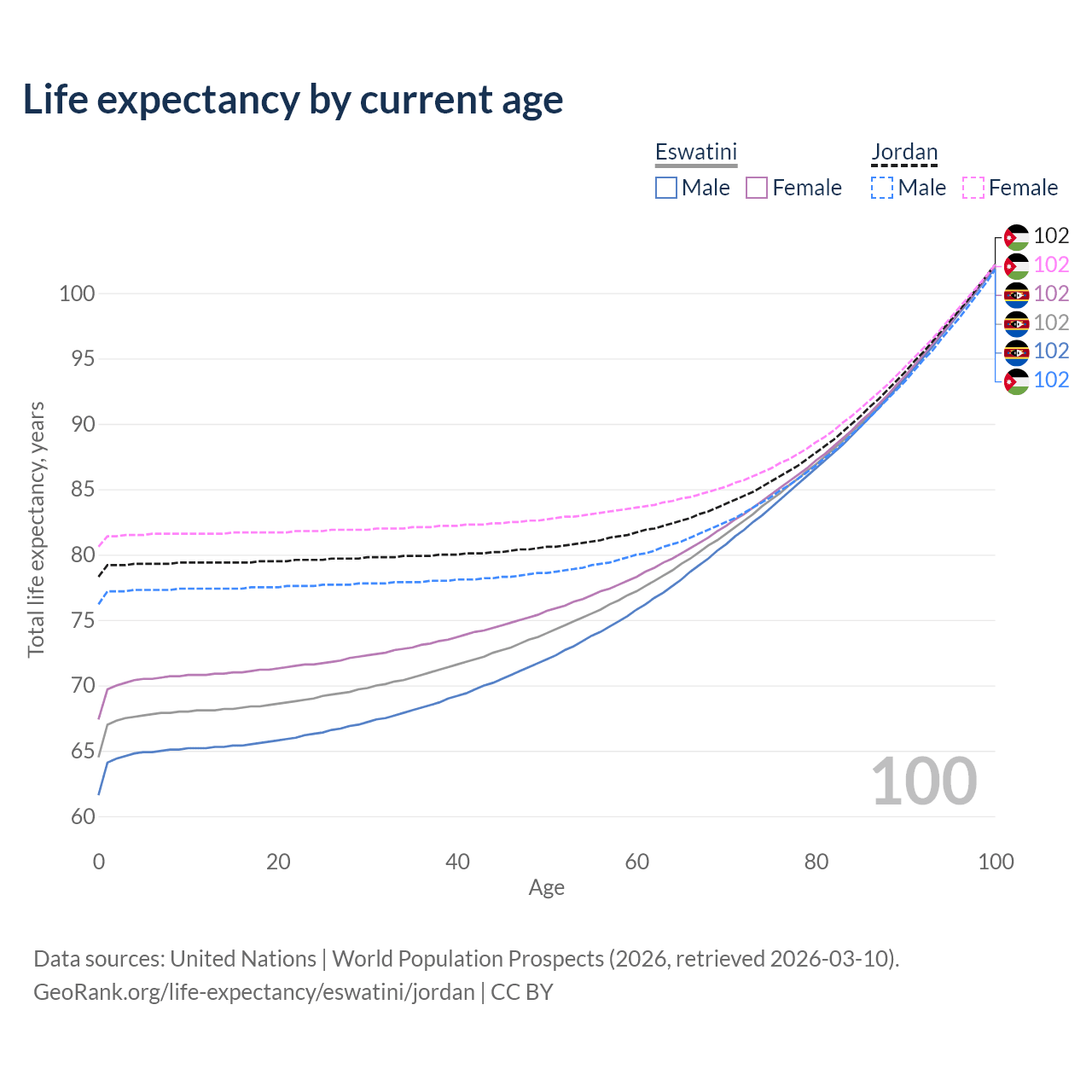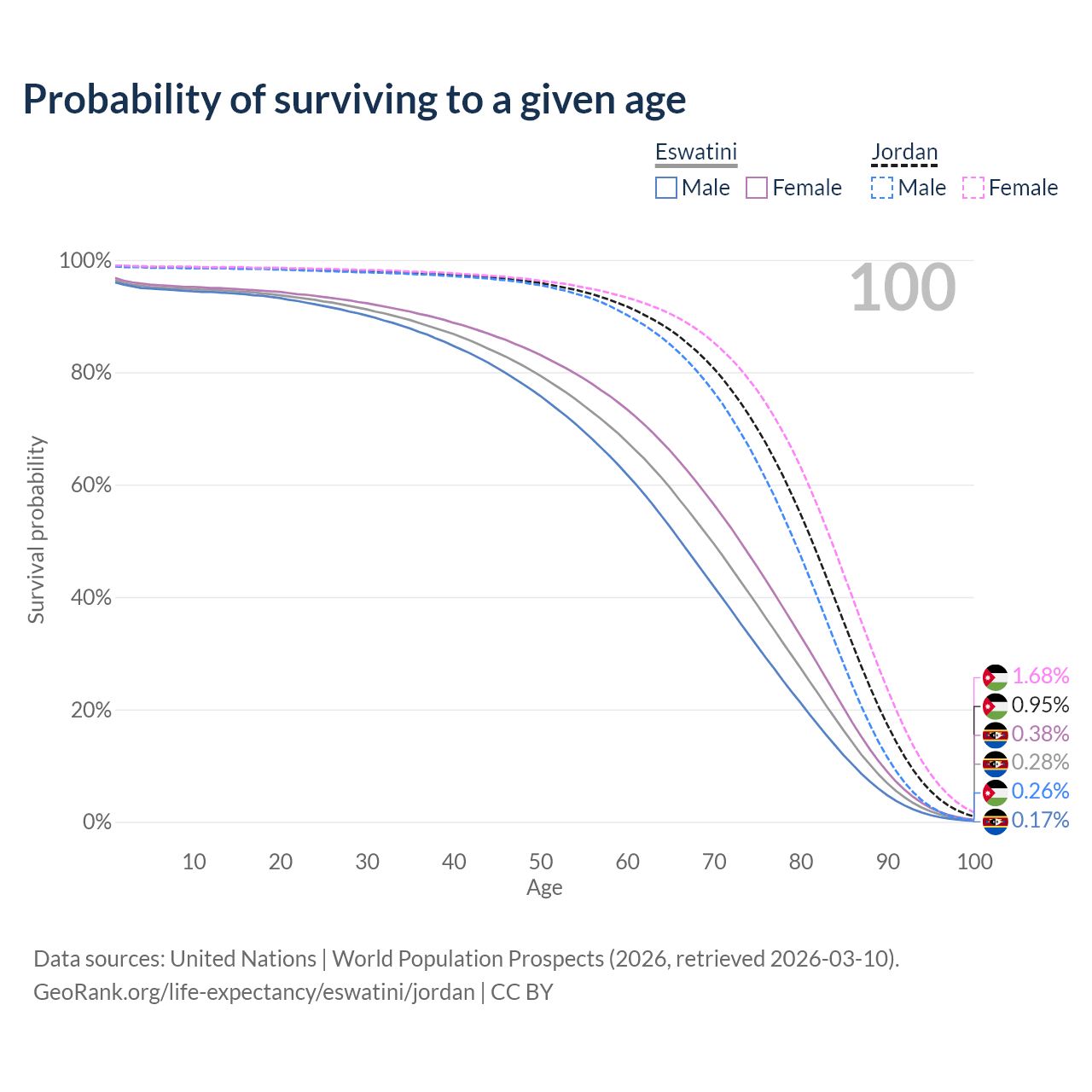 This life expectancy calculator shows the odds of living to 100, 95, 90, and below based on current age for both males and females in Eswatini and Jordan, along with mean and median age of death. The calculations are based on the 2026 life tables (actuarial tables) from the UN World Population Prospects.