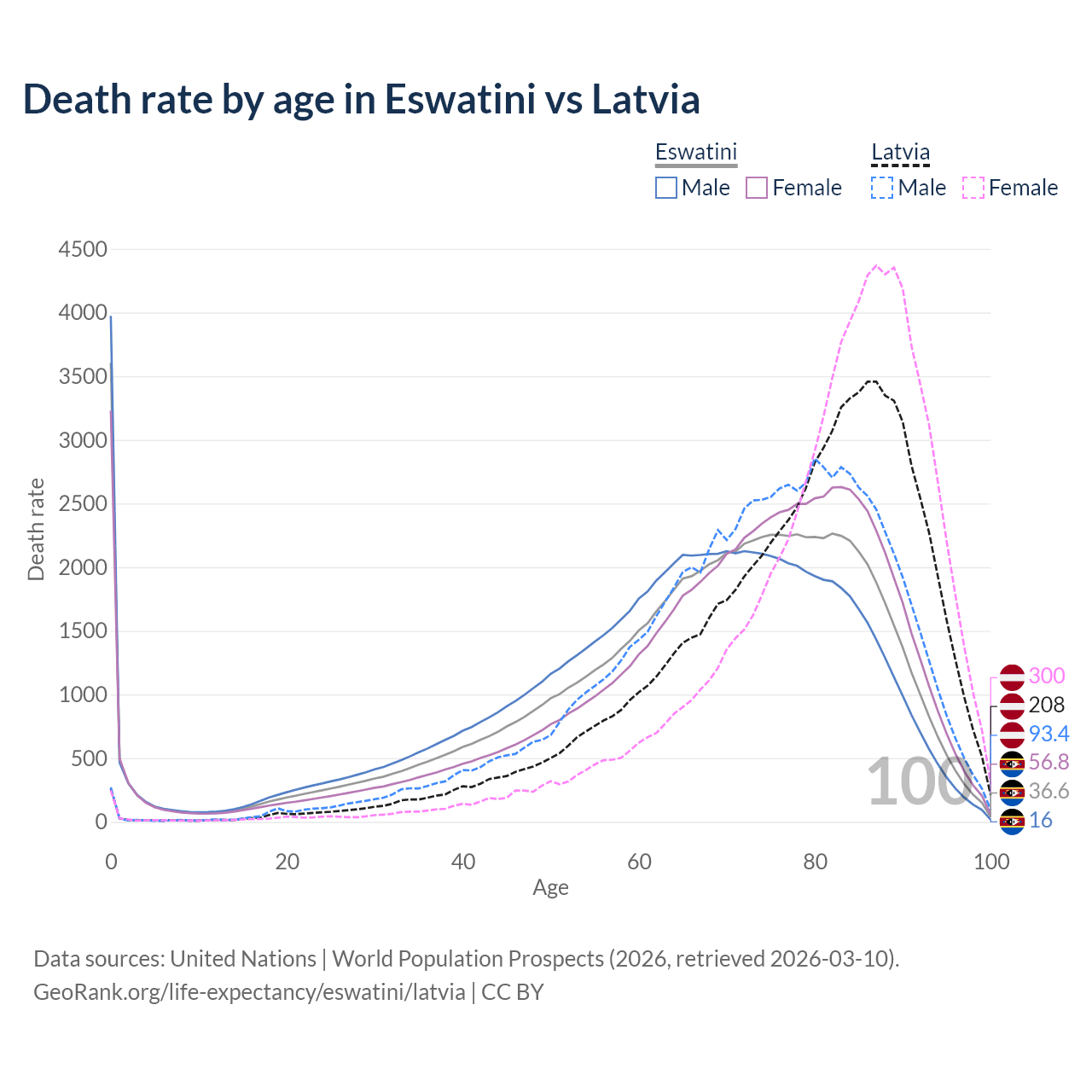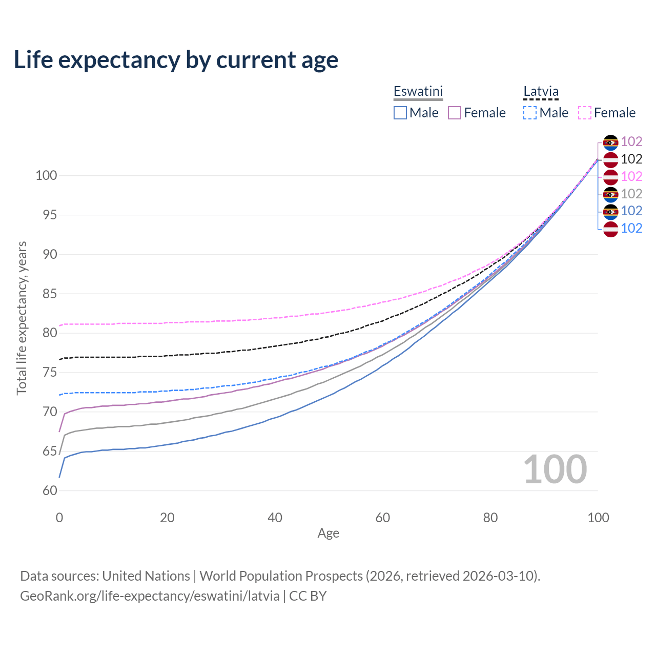 This life expectancy calculator shows the odds of living to 100, 95, 90, and below based on current age for both males and females in Eswatini and Latvia, along with mean and median age of death. The calculations are based on the 2026 life tables (actuarial tables) from the UN World Population Prospects.