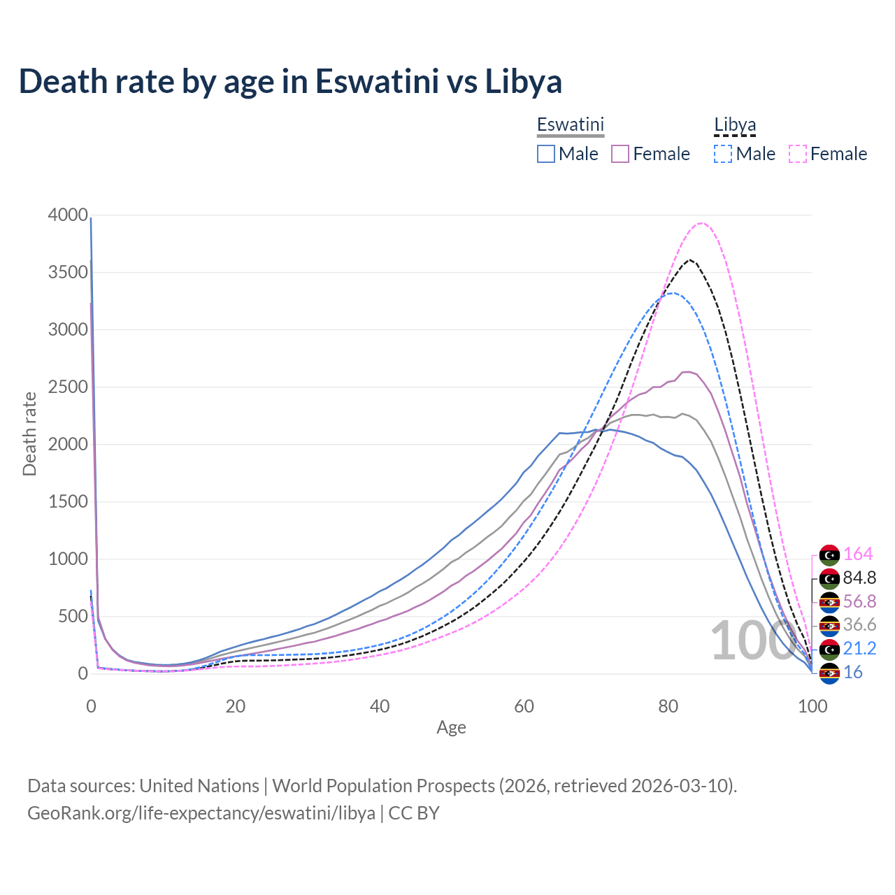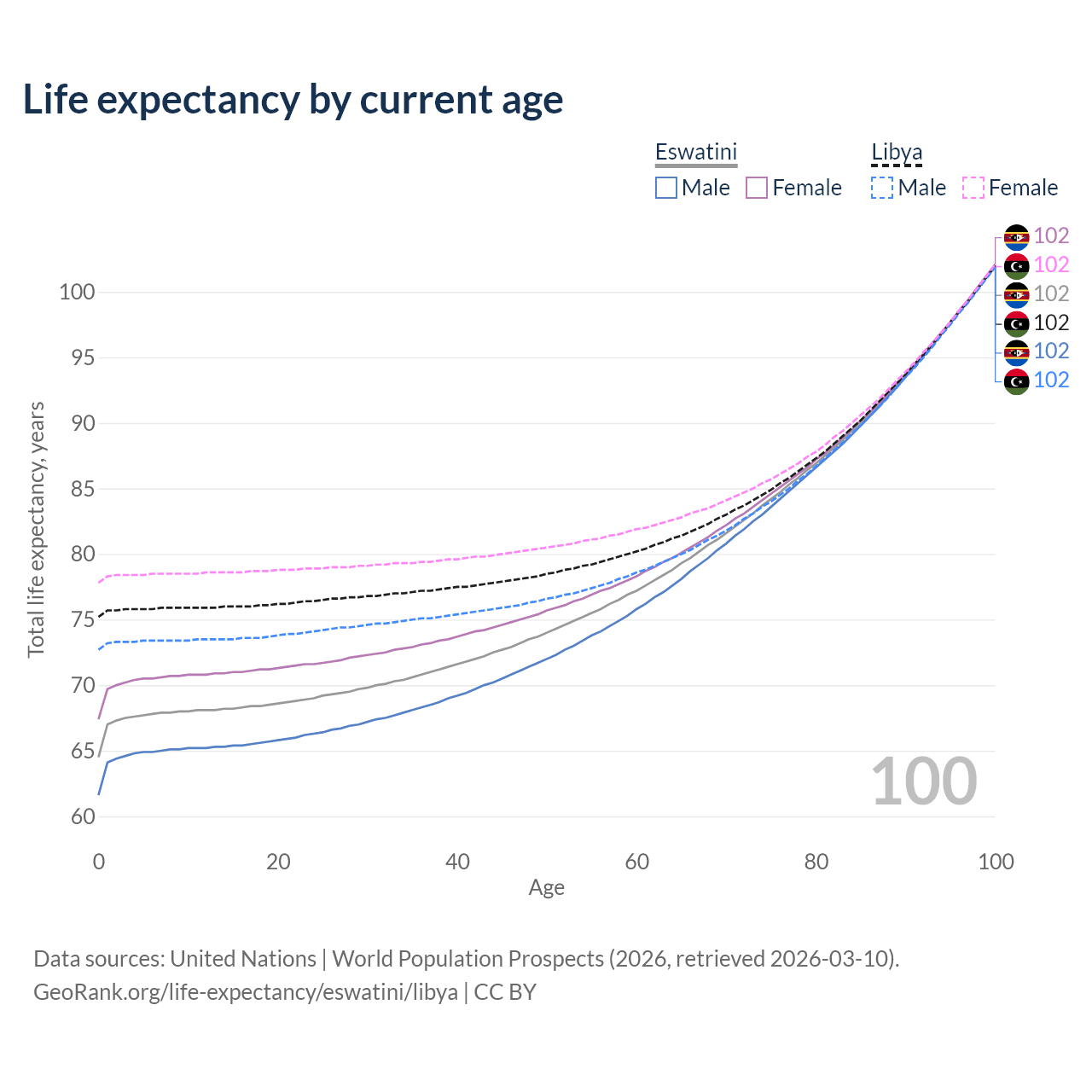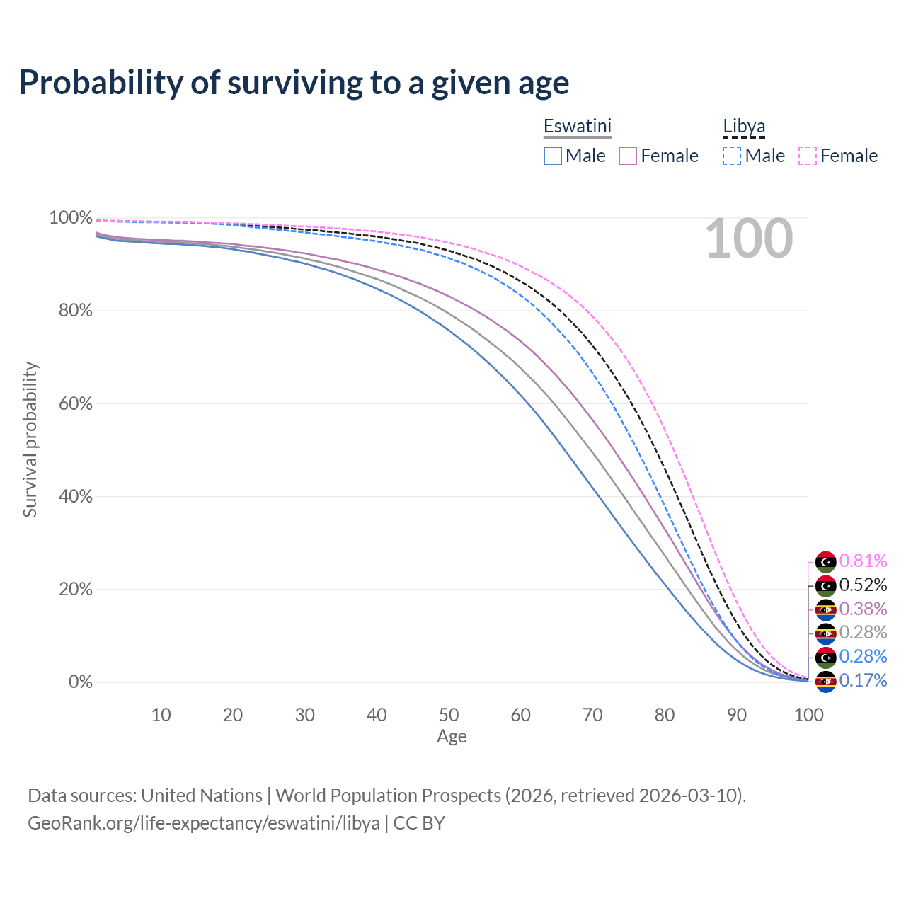 This life expectancy calculator shows the odds of living to 100, 95, 90, and below based on current age for both males and females in Eswatini and Libya, along with mean and median age of death. The calculations are based on the 2026 life tables (actuarial tables) from the UN World Population Prospects.