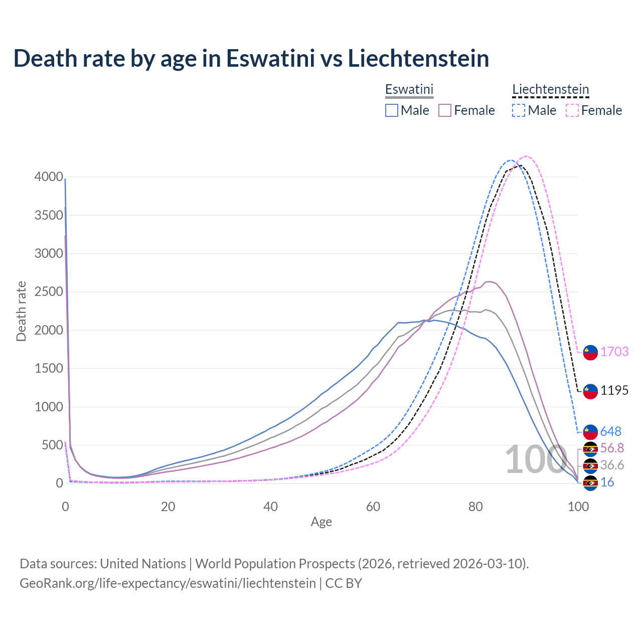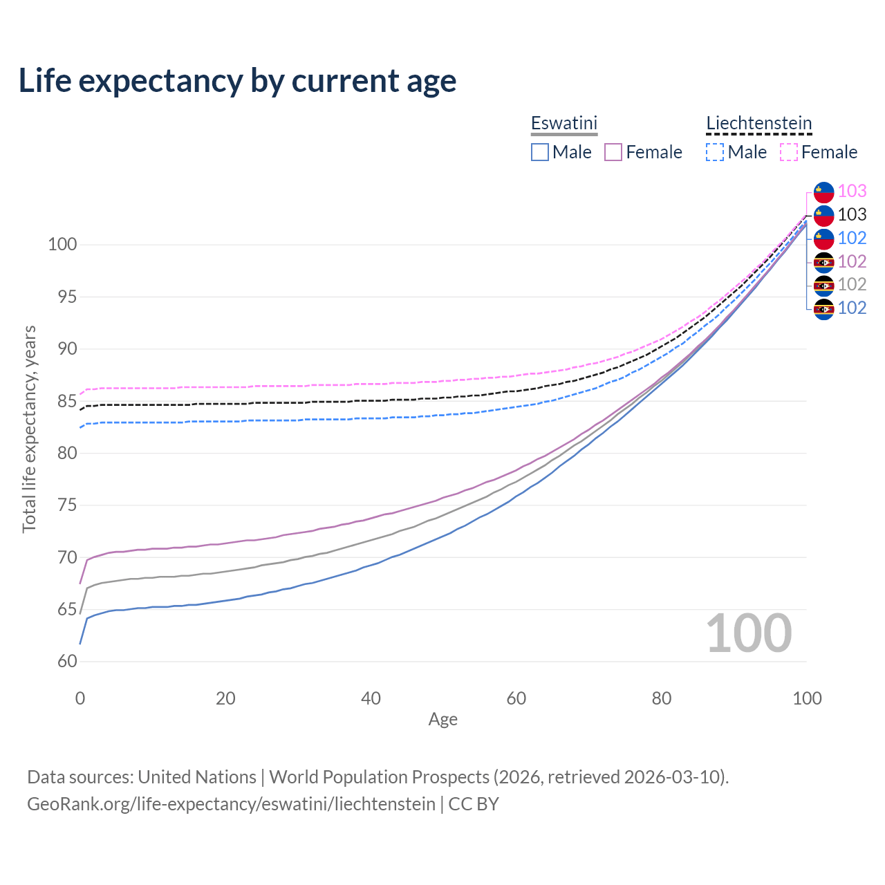 This life expectancy calculator shows the odds of living to 100, 95, 90, and below based on current age for both males and females in Eswatini and Liechtenstein, along with mean and median age of death. The calculations are based on the 2026 life tables (actuarial tables) from the UN World Population Prospects.