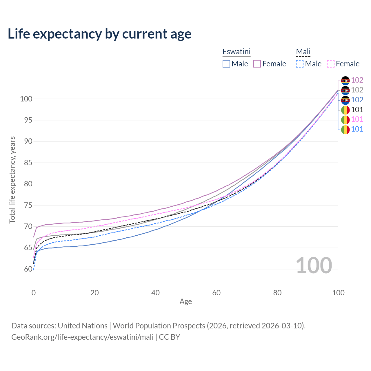This life expectancy calculator shows the odds of living to 100, 95, 90, and below based on current age for both males and females in Eswatini and Mali, along with mean and median age of death. The calculations are based on the 2026 life tables (actuarial tables) from the UN World Population Prospects.