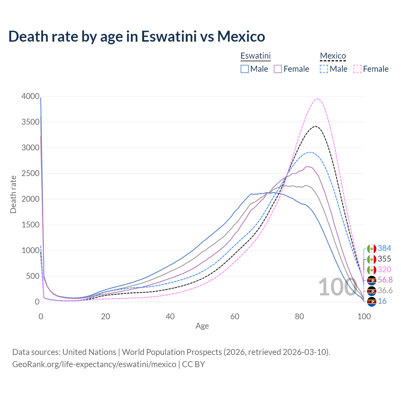 In Eswatini, the most common age of death is 0, compared to 85 in Mexico. The median age of death is 69.7 in Eswatini and 80.1 in Mexico, meaning only half of each cohort is expected to live past that age.