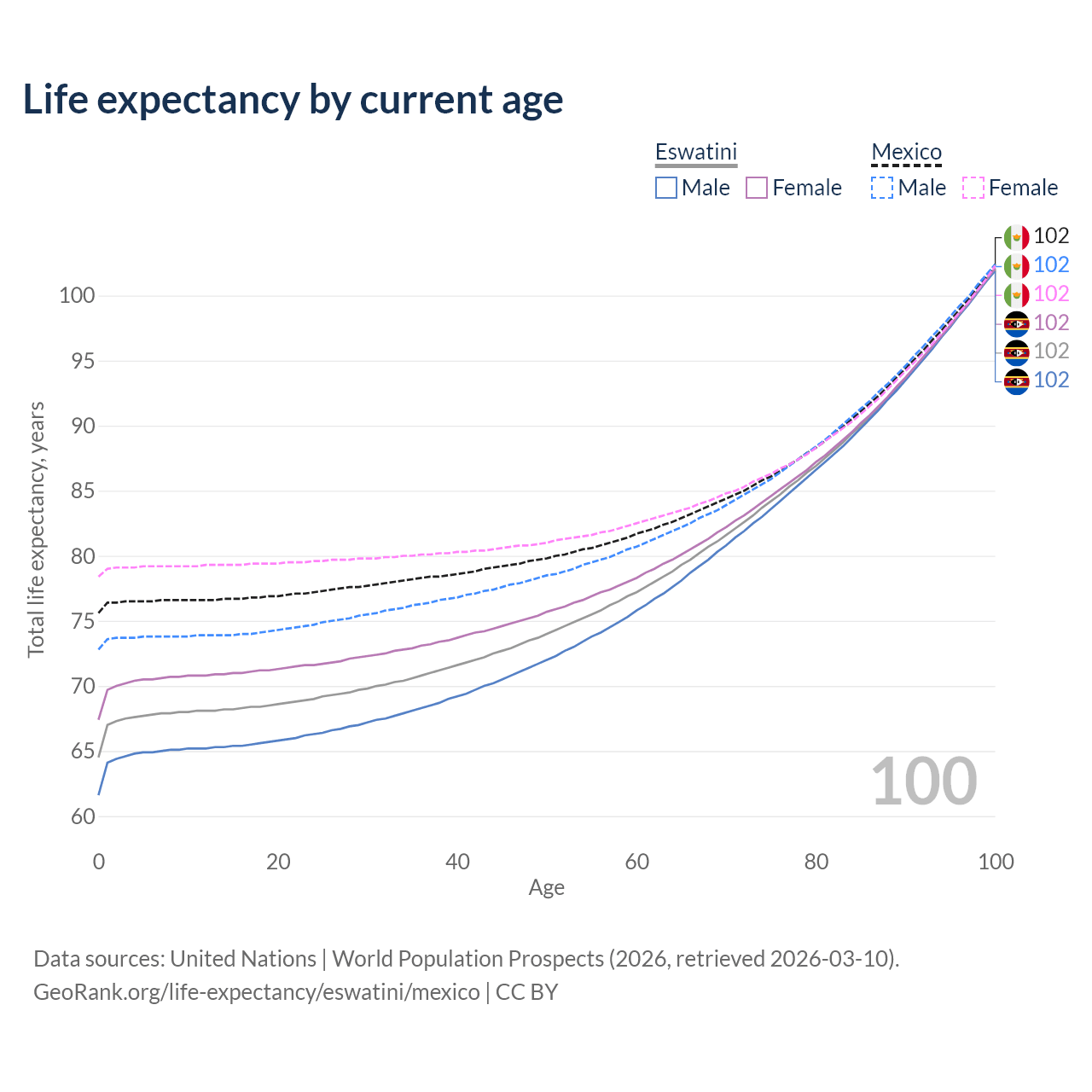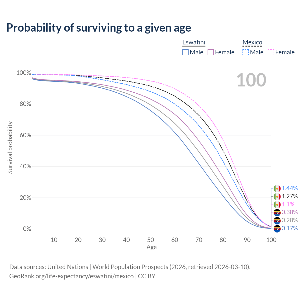 This life expectancy calculator shows the odds of living to 100, 95, 90, and below based on current age for both males and females in Eswatini and Mexico, along with mean and median age of death. The calculations are based on the 2026 life tables (actuarial tables) from the UN World Population Prospects.