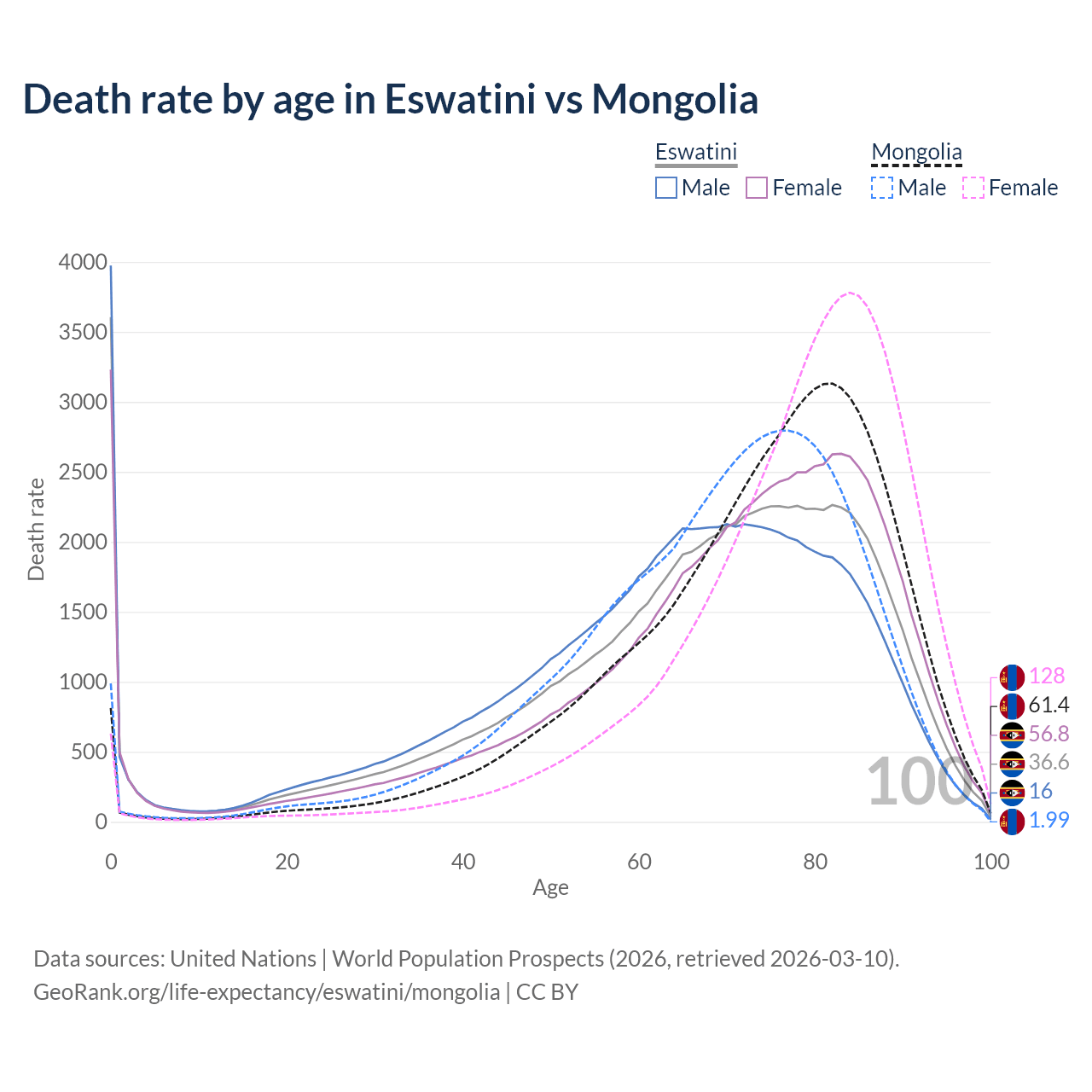 In Eswatini, the most common age of death is 0, compared to 82 in Mongolia. The median age of death is 69.7 in Eswatini and 76 in Mongolia, meaning only half of each cohort is expected to live past that age.