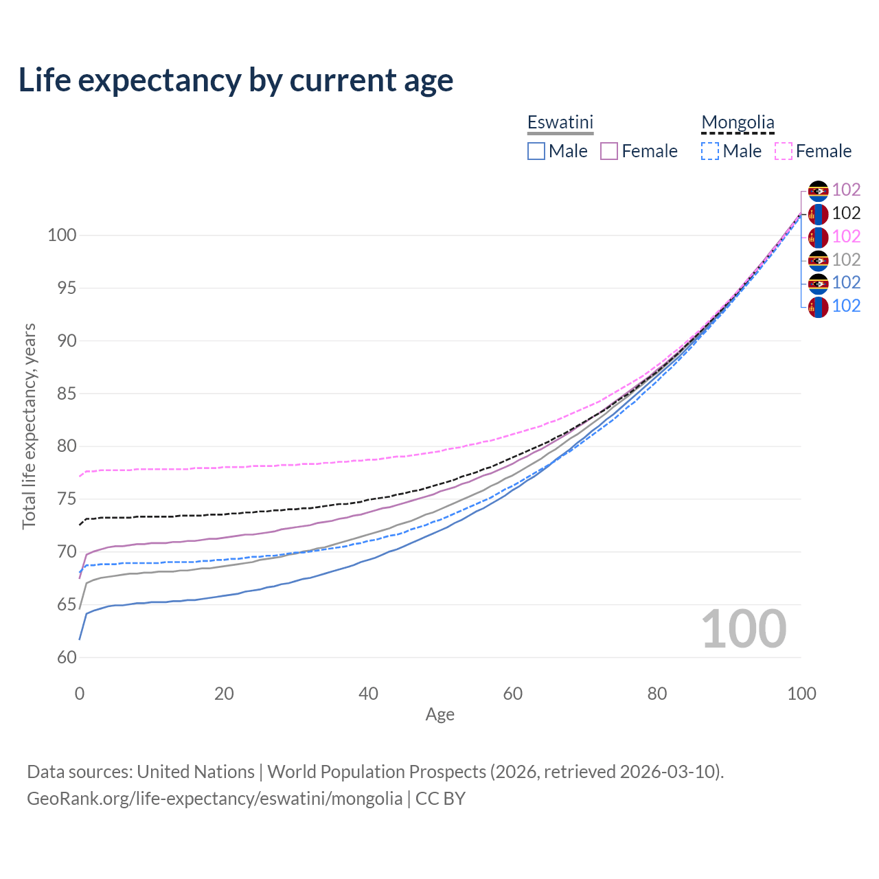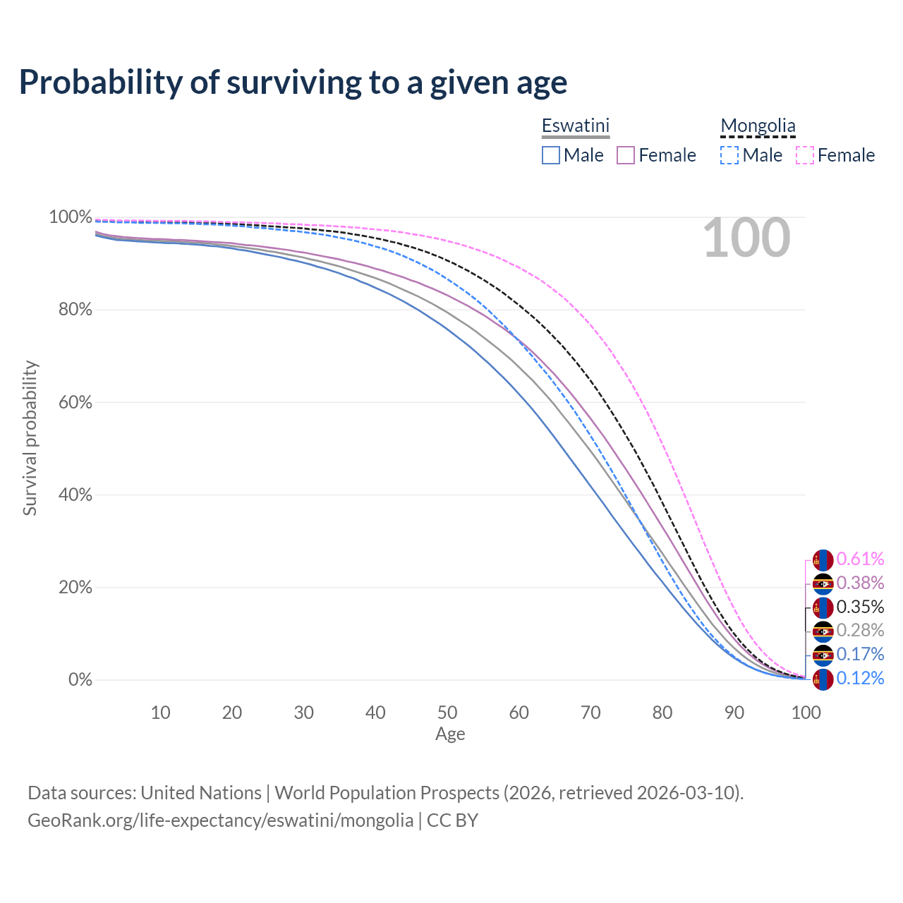 This life expectancy calculator shows the odds of living to 100, 95, 90, and below based on current age for both males and females in Eswatini and Mongolia, along with mean and median age of death. The calculations are based on the 2026 life tables (actuarial tables) from the UN World Population Prospects.