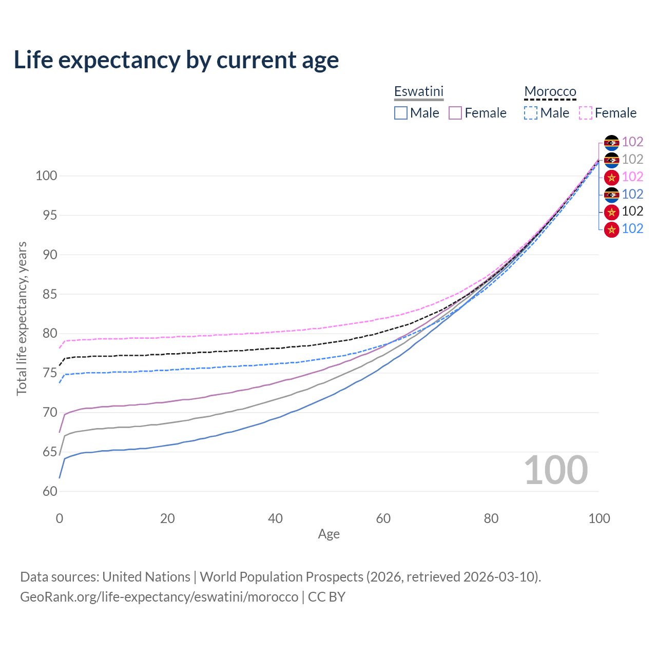 This life expectancy calculator shows the odds of living to 100, 95, 90, and below based on current age for both males and females in Eswatini and Morocco, along with mean and median age of death. The calculations are based on the 2026 life tables (actuarial tables) from the UN World Population Prospects.