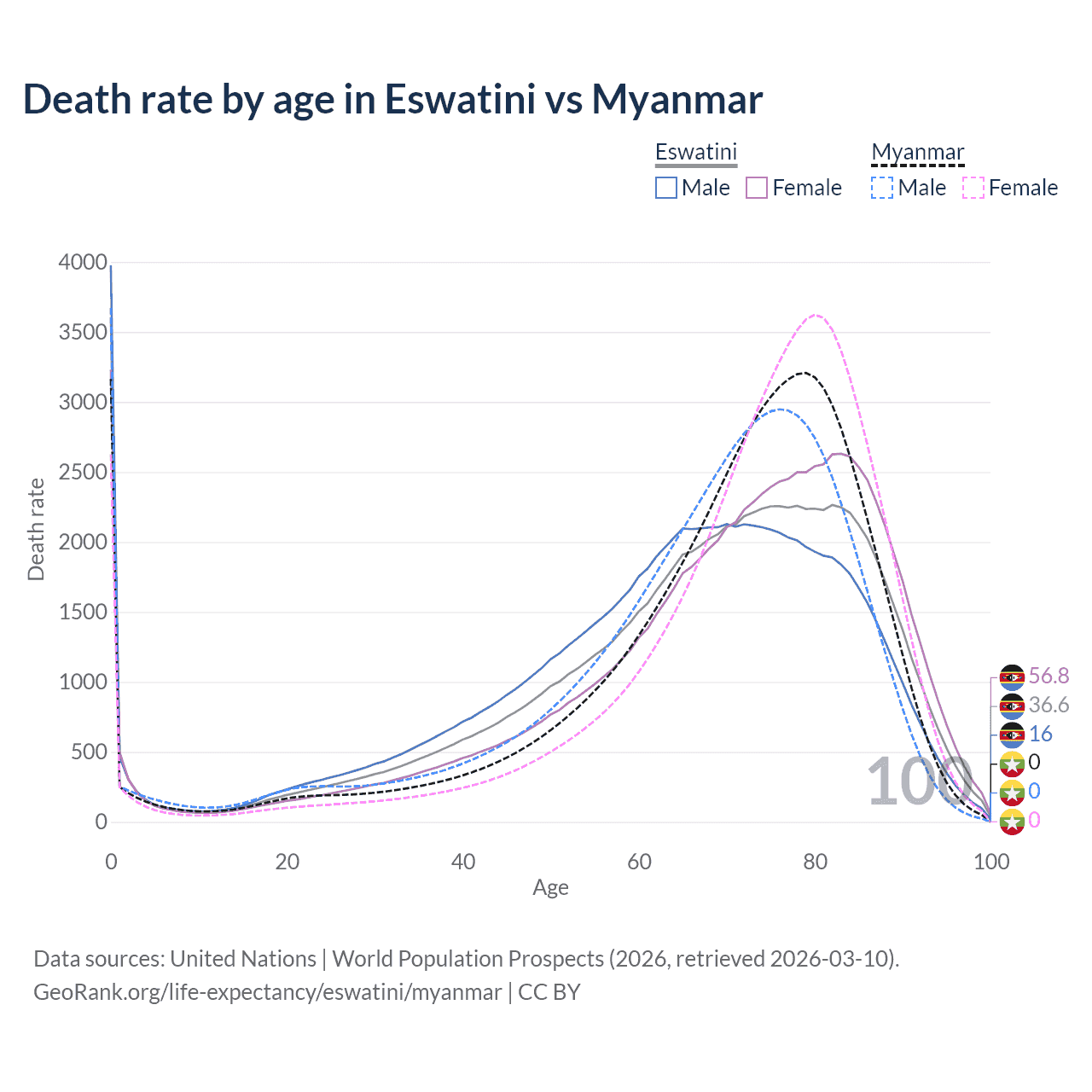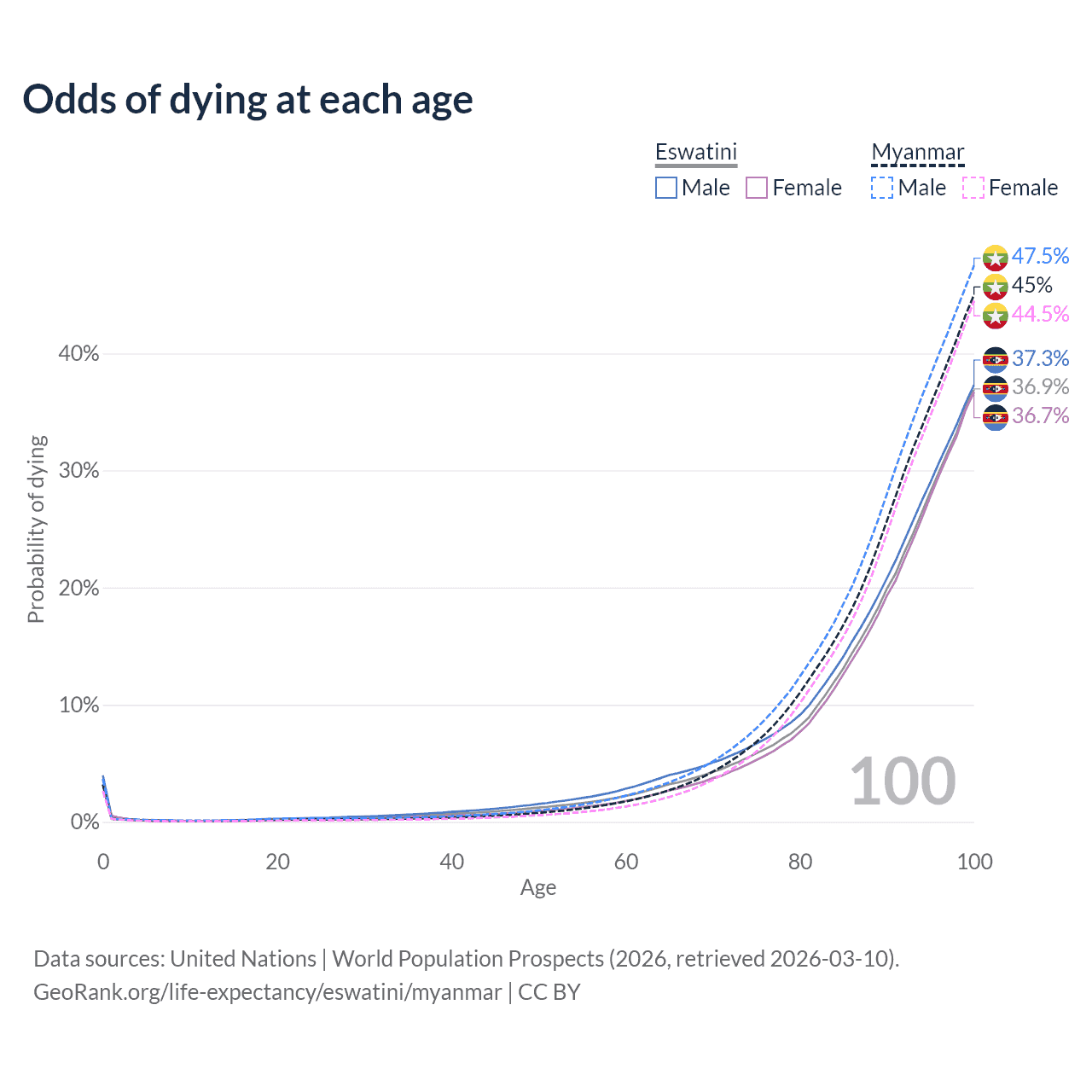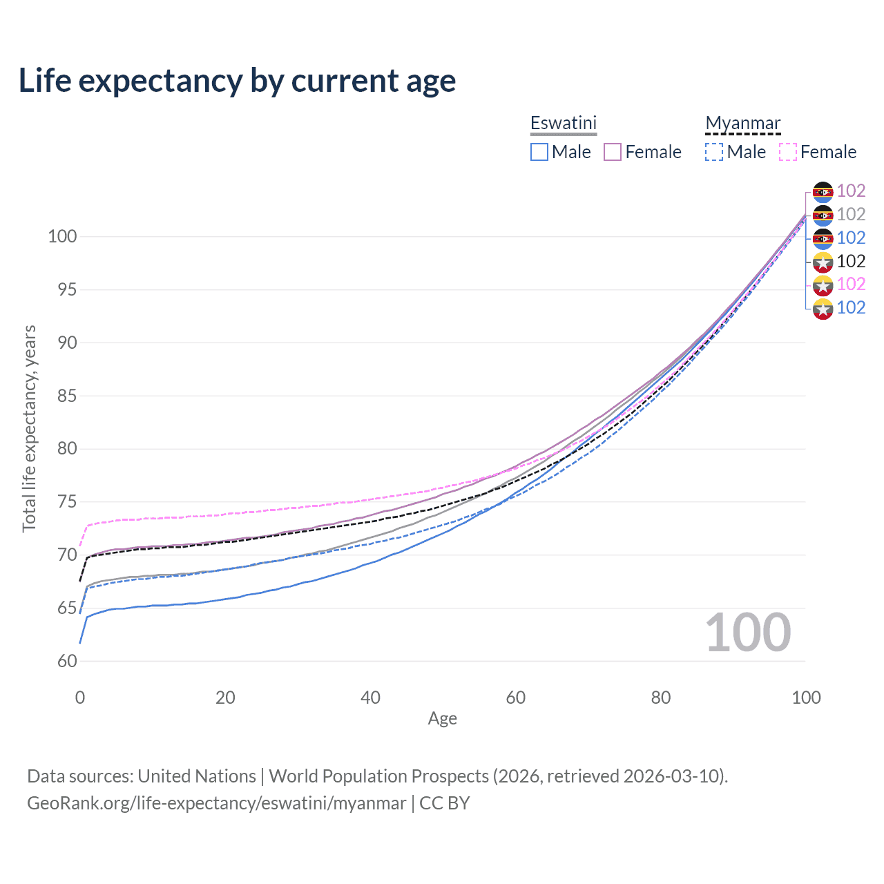 This life expectancy calculator shows the odds of living to 100, 95, 90, and below based on current age for both males and females in Eswatini and Myanmar, along with mean and median age of death. The calculations are based on the 2026 life tables (actuarial tables) from the UN World Population Prospects.