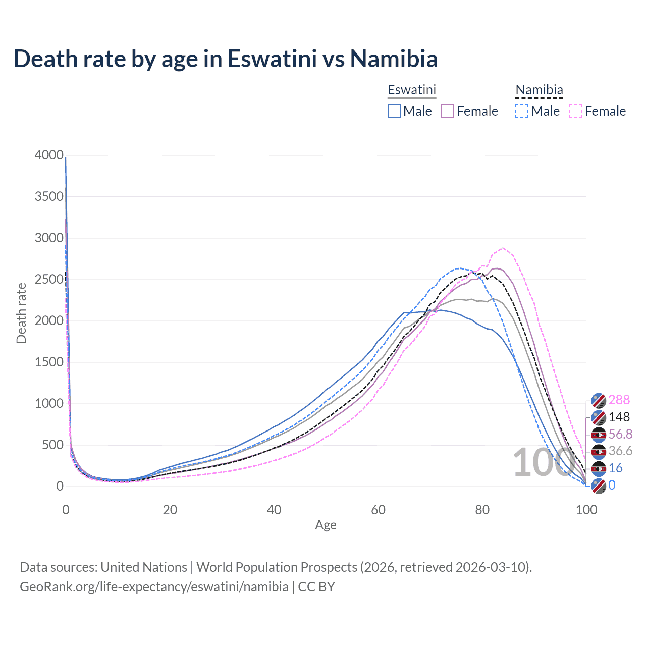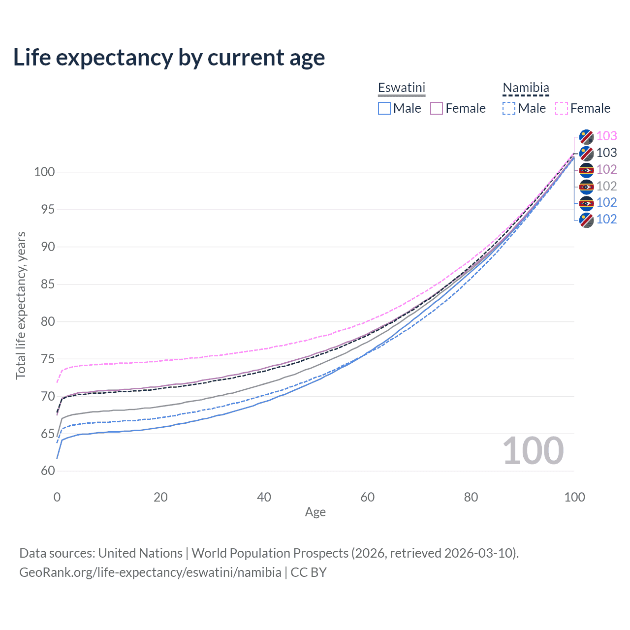 This life expectancy calculator shows the odds of living to 100, 95, 90, and below based on current age for both males and females in Eswatini and Namibia, along with mean and median age of death. The calculations are based on the 2026 life tables (actuarial tables) from the UN World Population Prospects.