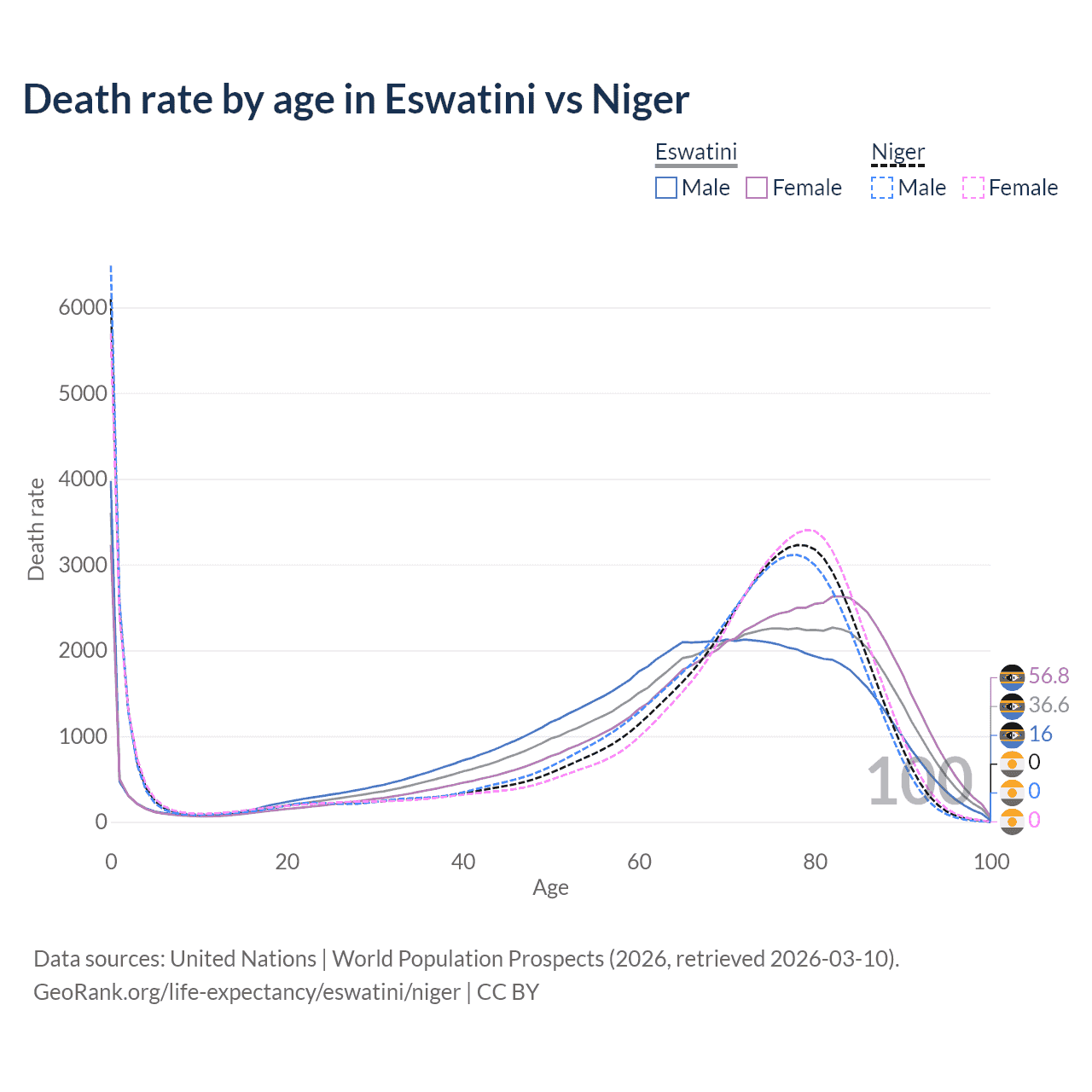 In Eswatini, the most common age of death is 0, compared to 0 in Niger. The median age of death is 69.7 in Eswatini and 71.7 in Niger, meaning only half of each cohort is expected to live past that age.