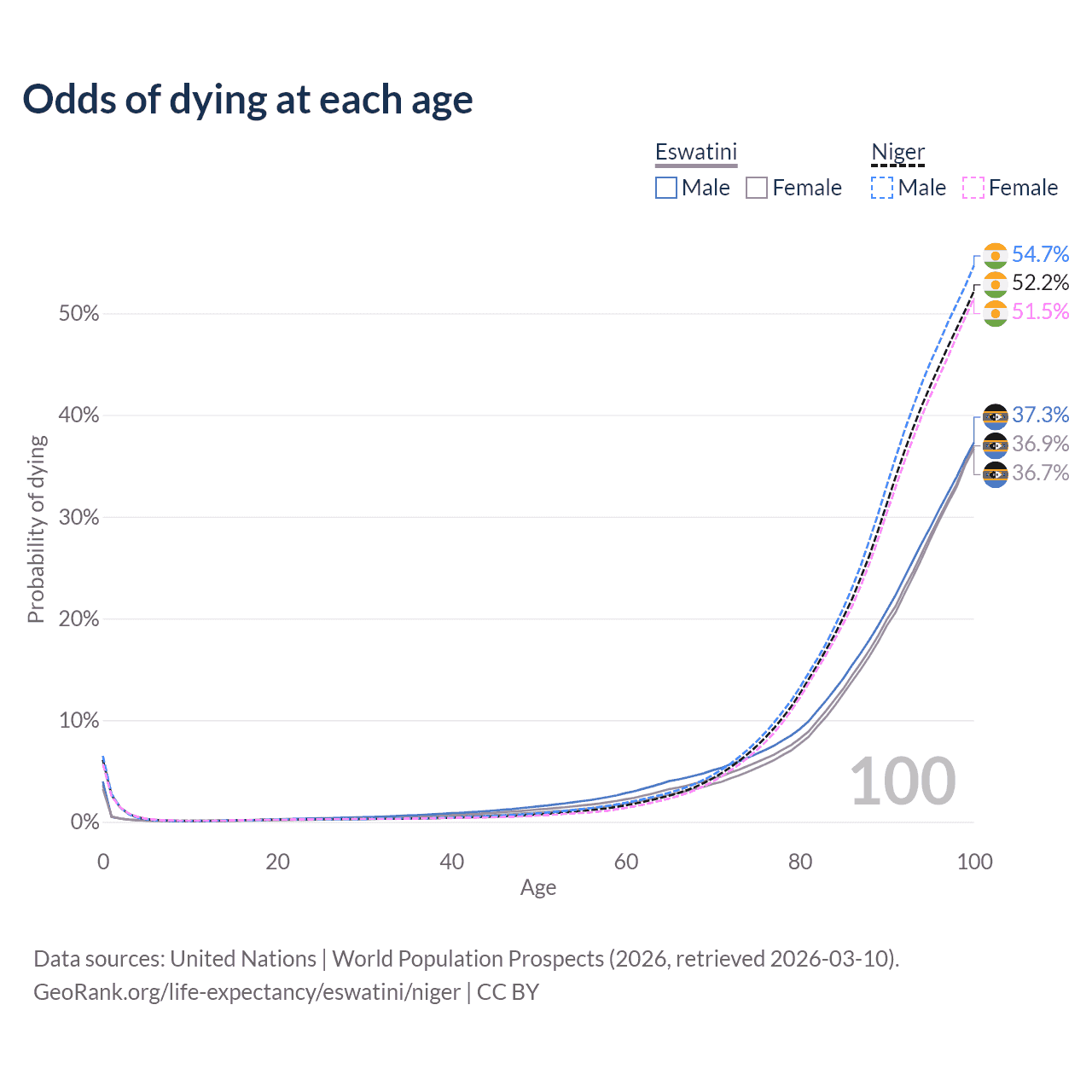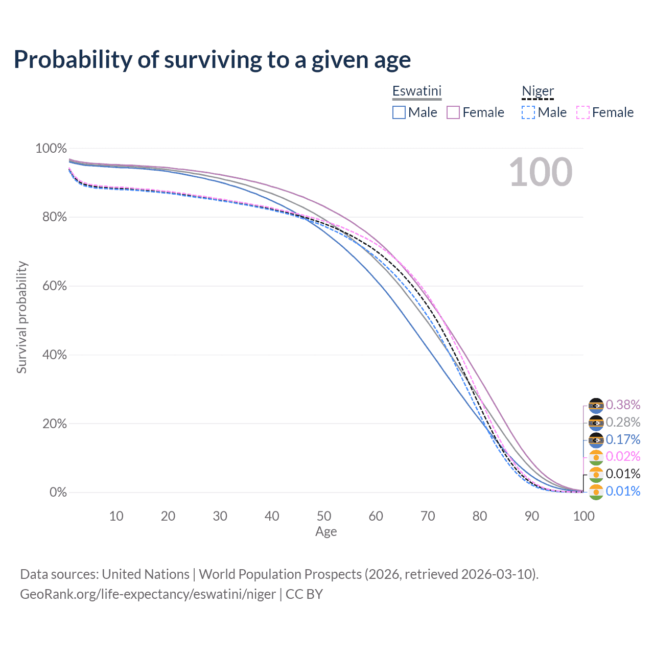 This life expectancy calculator shows the odds of living to 100, 95, 90, and below based on current age for both males and females in Eswatini and Niger, along with mean and median age of death. The calculations are based on the 2026 life tables (actuarial tables) from the UN World Population Prospects.