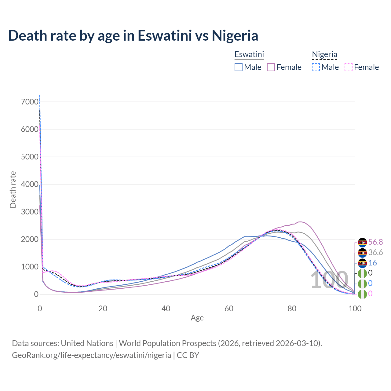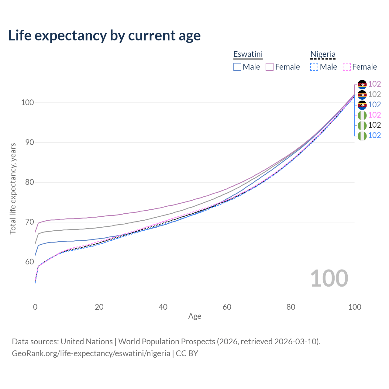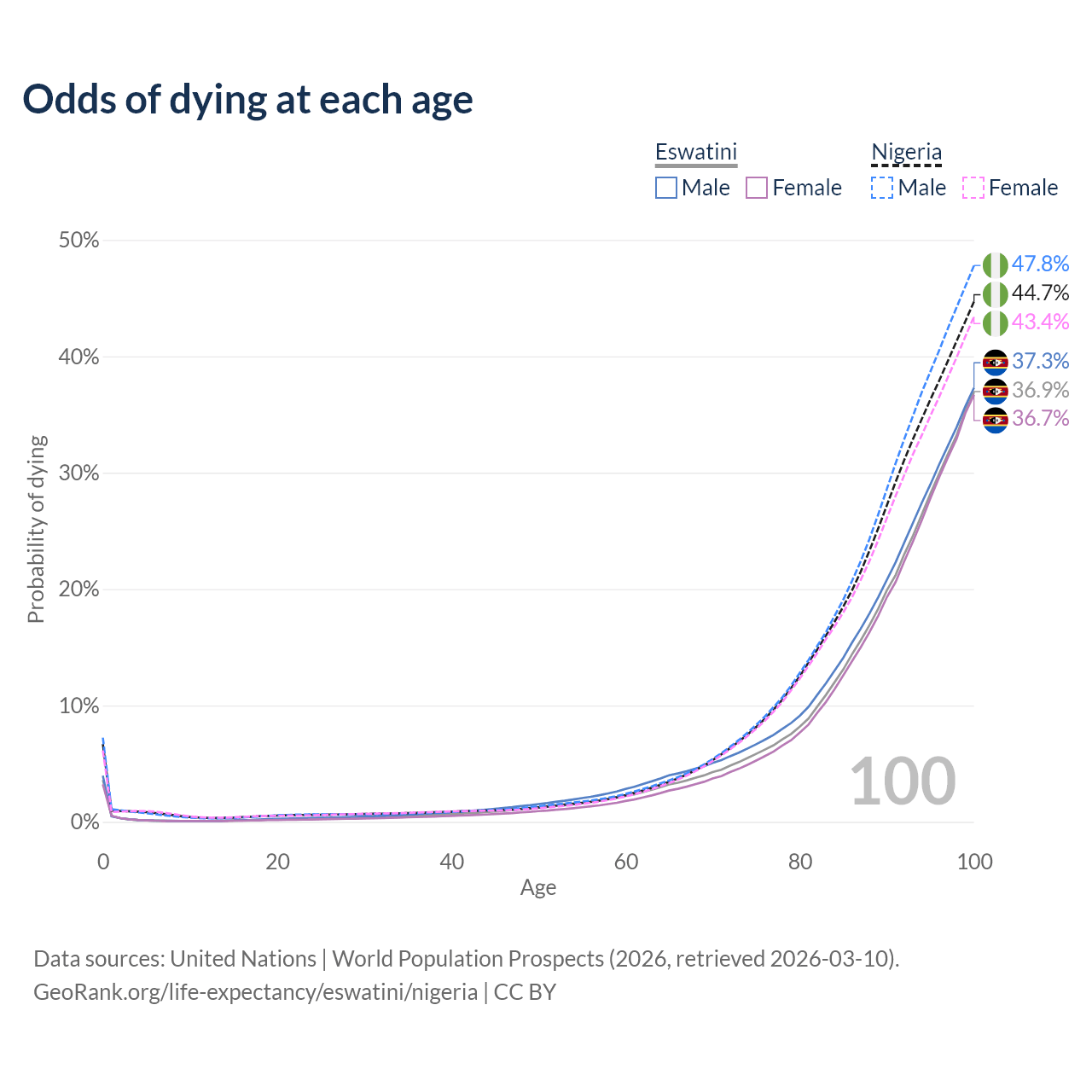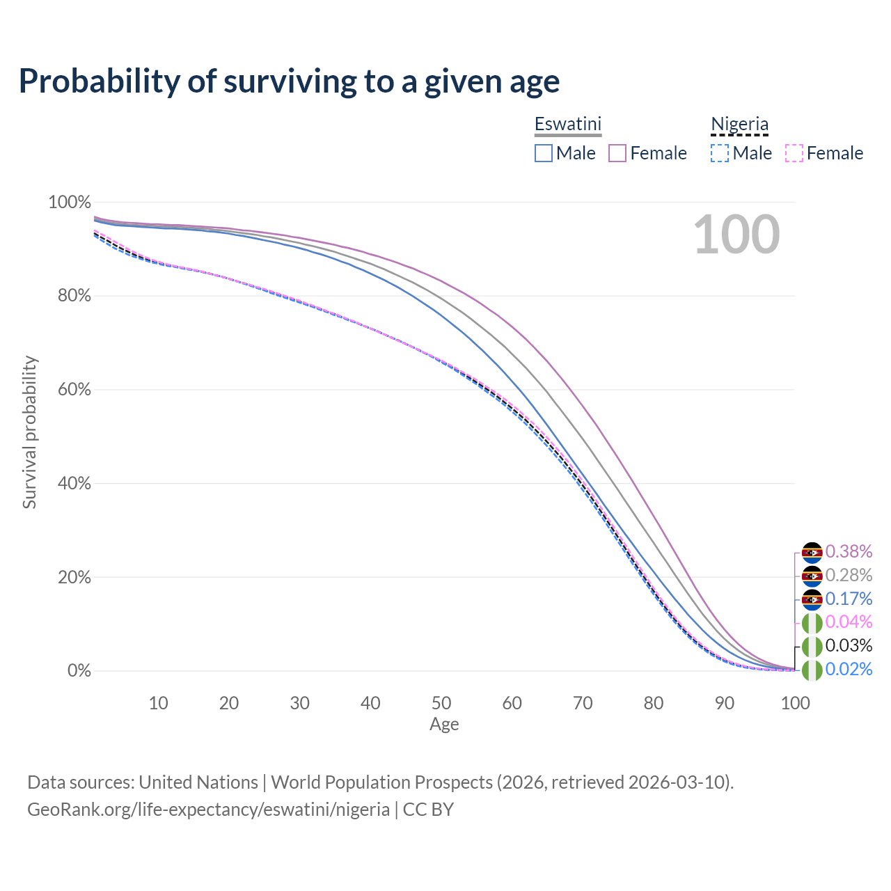 This life expectancy calculator shows the odds of living to 100, 95, 90, and below based on current age for both males and females in Eswatini and Nigeria, along with mean and median age of death. The calculations are based on the 2026 life tables (actuarial tables) from the UN World Population Prospects.