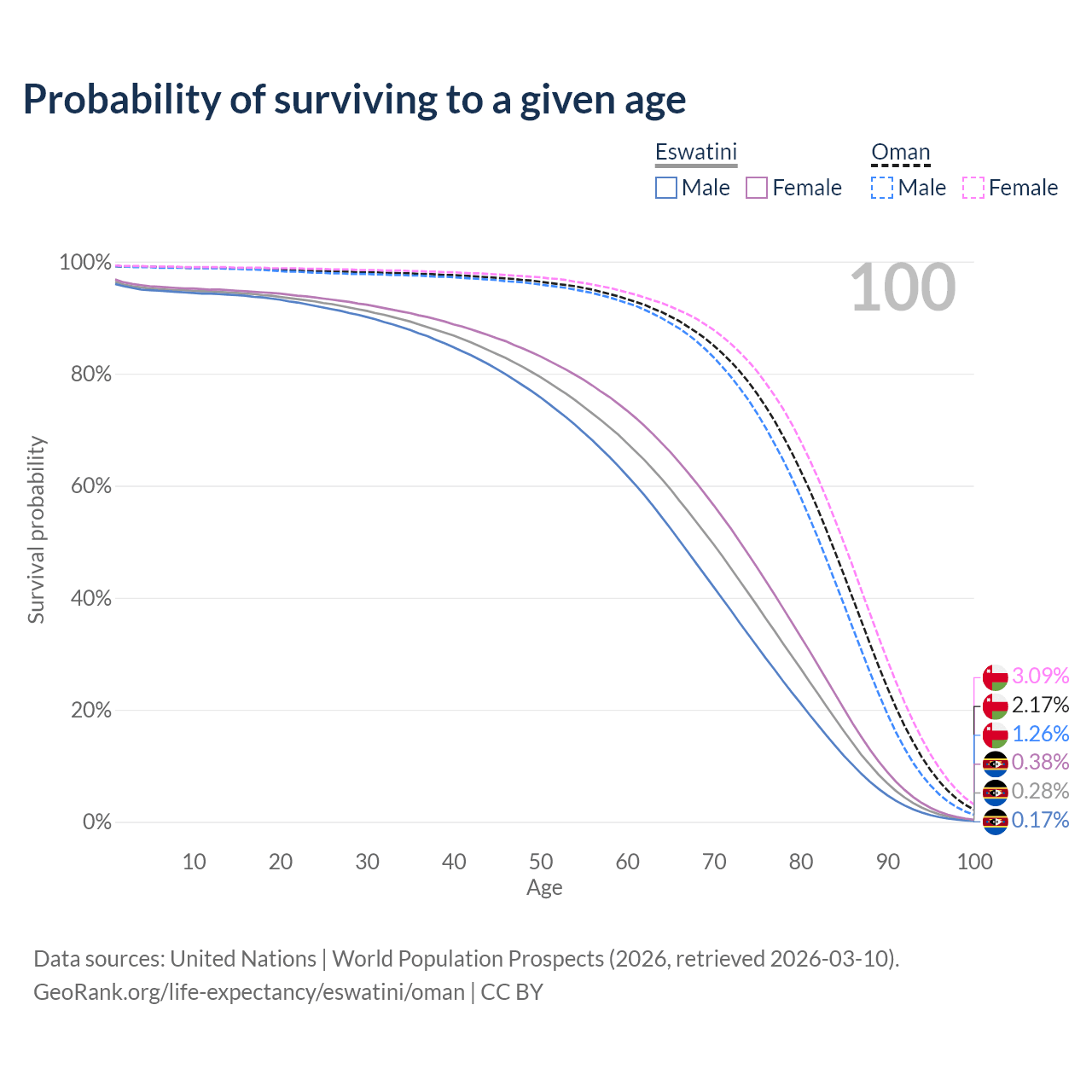 This life expectancy calculator shows the odds of living to 100, 95, 90, and below based on current age for both males and females in Eswatini and Oman, along with mean and median age of death. The calculations are based on the 2026 life tables (actuarial tables) from the UN World Population Prospects.