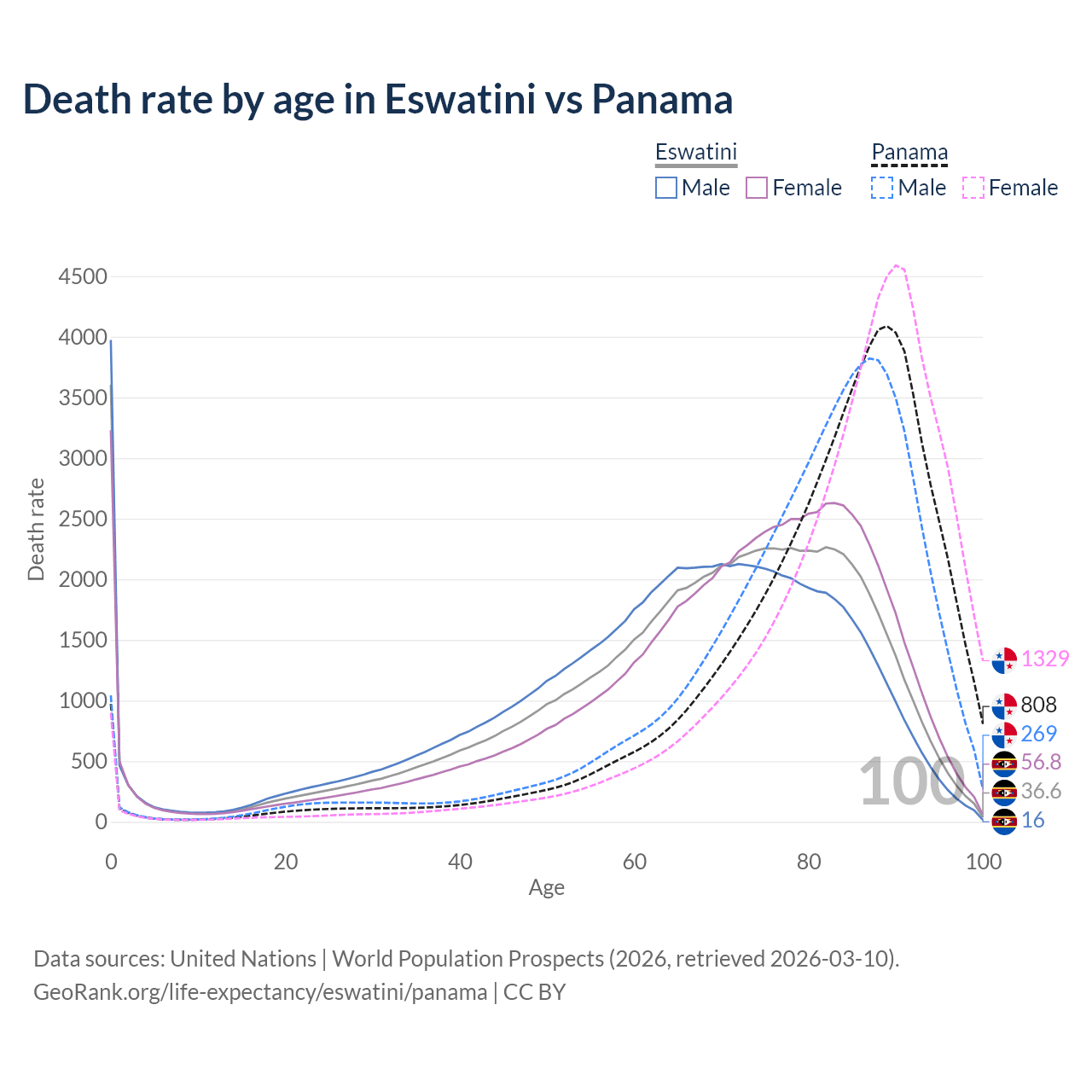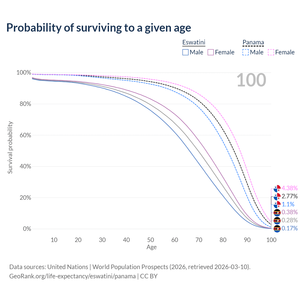 This life expectancy calculator shows the odds of living to 100, 95, 90, and below based on current age for both males and females in Eswatini and Panama, along with mean and median age of death. The calculations are based on the 2026 life tables (actuarial tables) from the UN World Population Prospects.