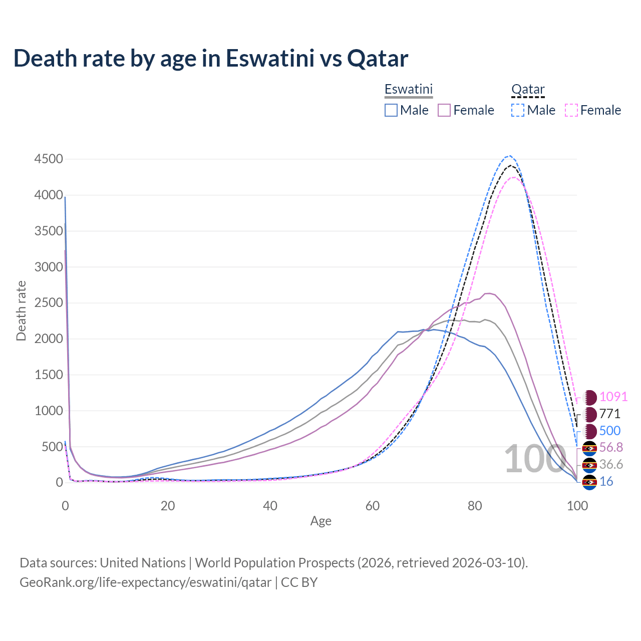 This life expectancy calculator shows the odds of living to 100, 95, 90, and below based on current age for both males and females in Eswatini and Qatar, along with mean and median age of death. The calculations are based on the 2026 life tables (actuarial tables) from the UN World Population Prospects.