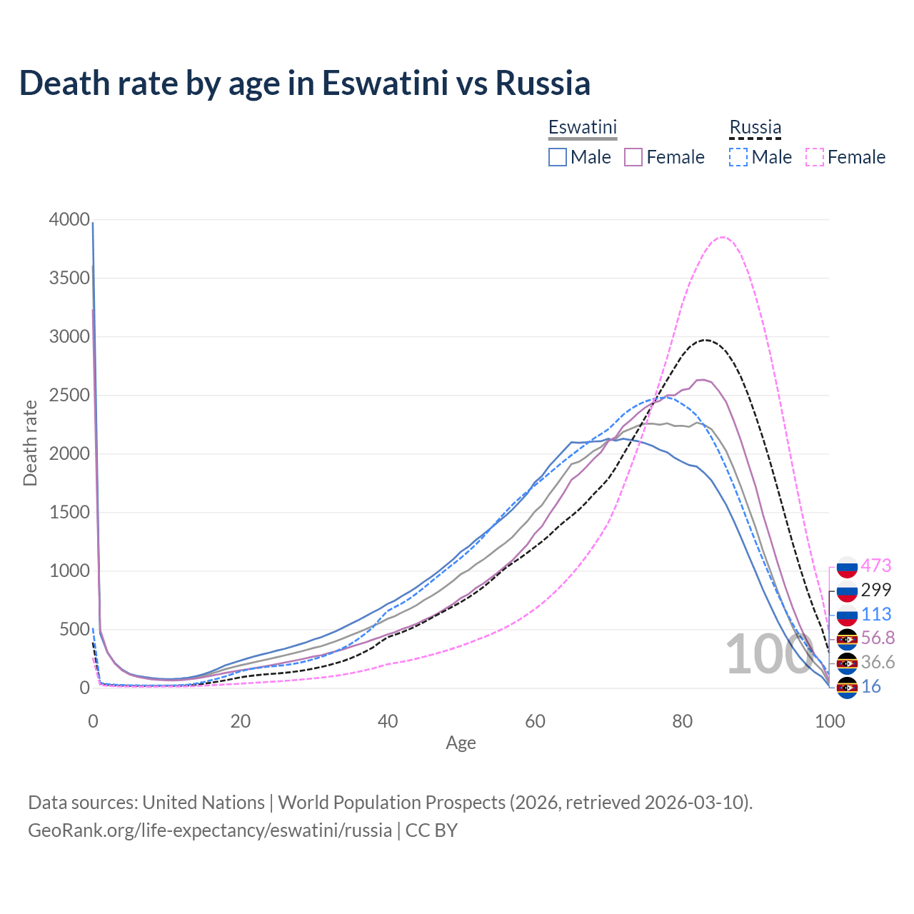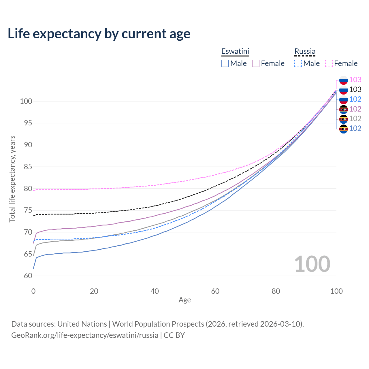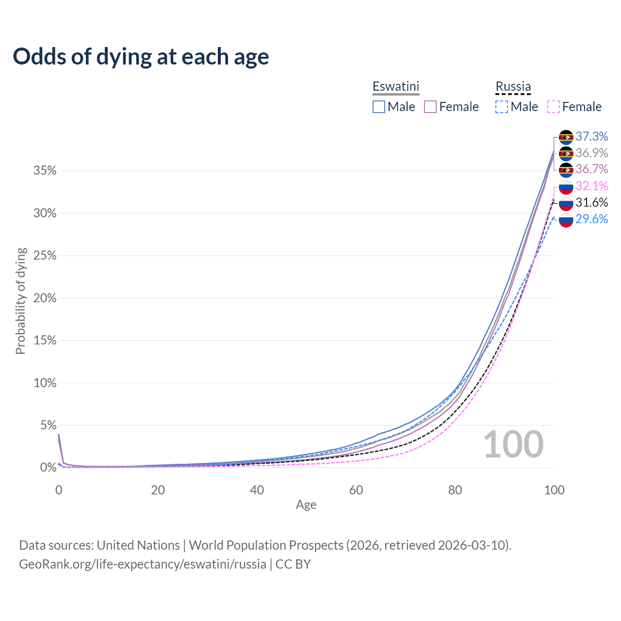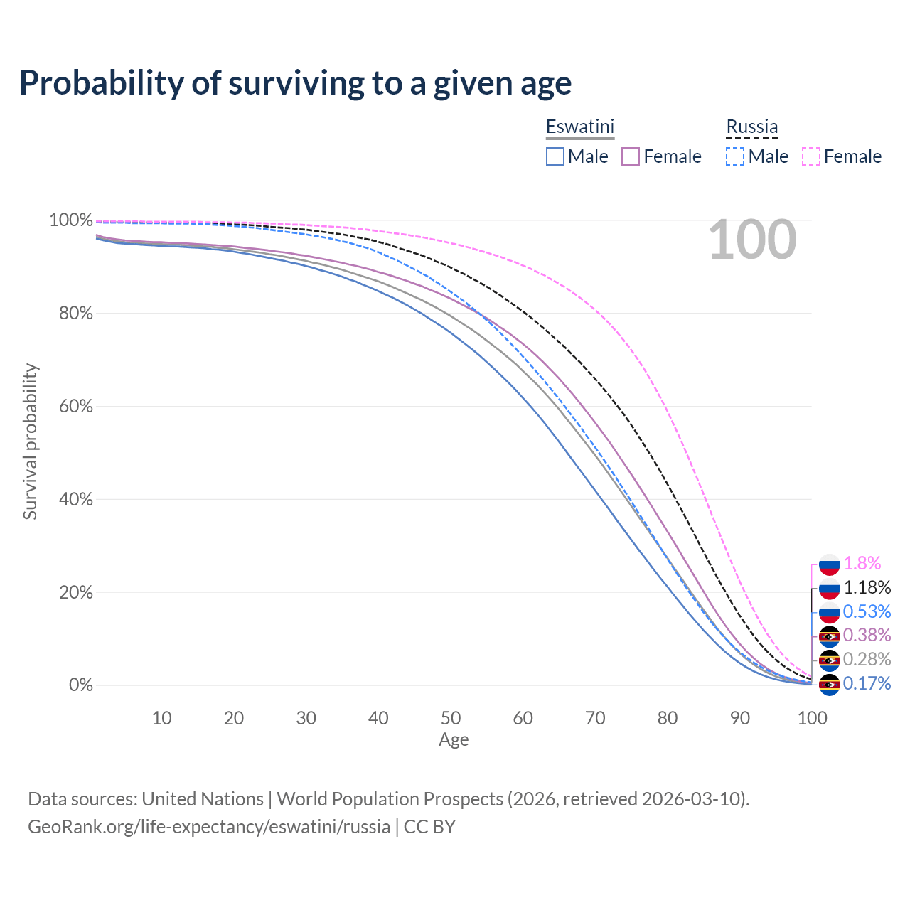 This life expectancy calculator shows the odds of living to 100, 95, 90, and below based on current age for both males and females in Eswatini and Russia, along with mean and median age of death. The calculations are based on the 2026 life tables (actuarial tables) from the UN World Population Prospects.