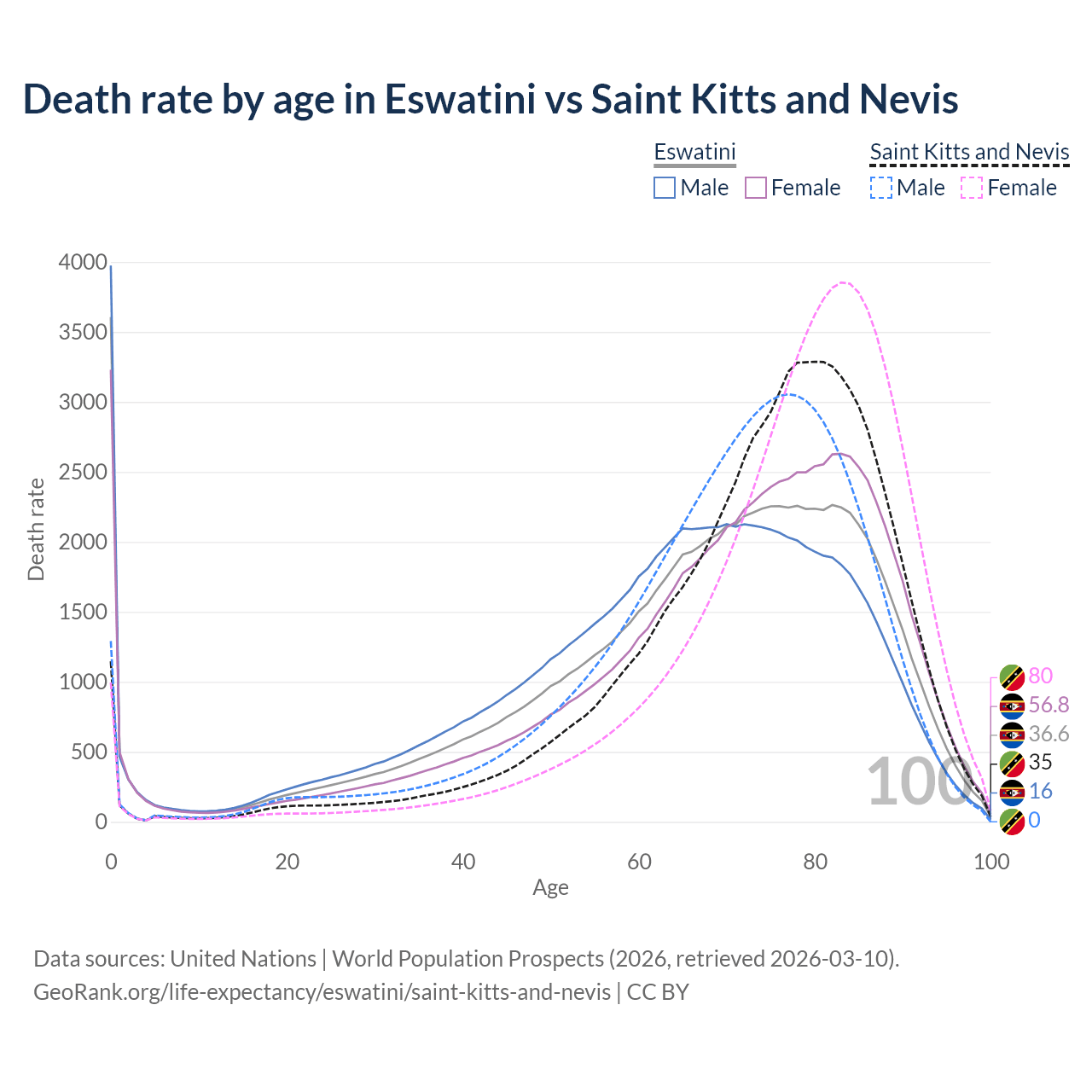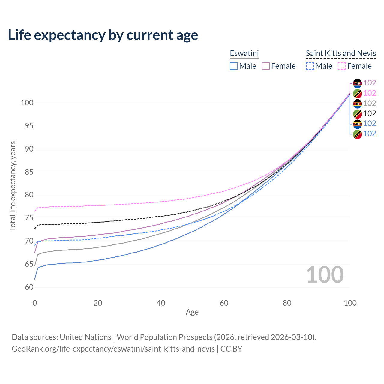 This life expectancy calculator shows the odds of living to 100, 95, 90, and below based on current age for both males and females in Eswatini and Saint Kitts and Nevis, along with mean and median age of death. The calculations are based on the 2026 life tables (actuarial tables) from the UN World Population Prospects.