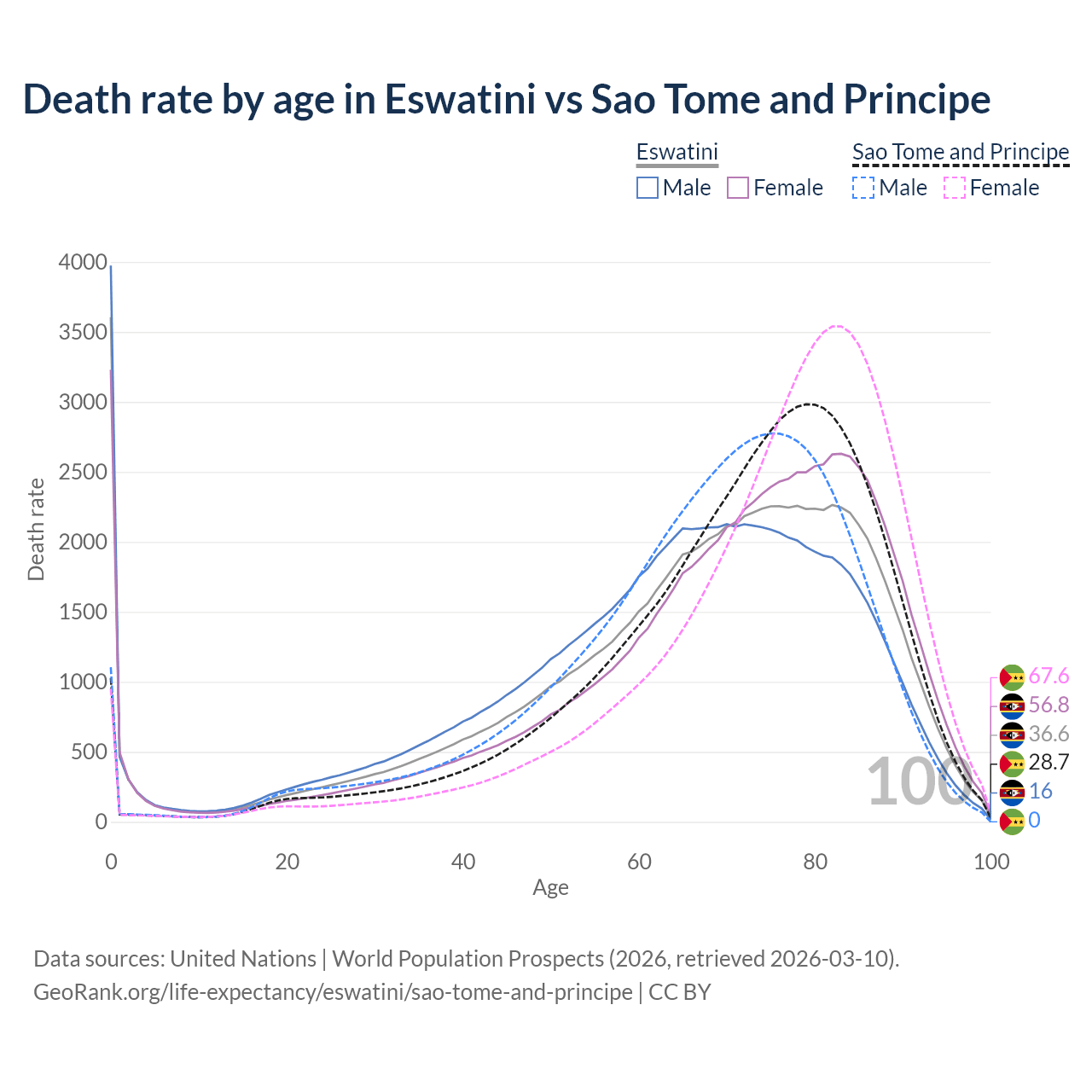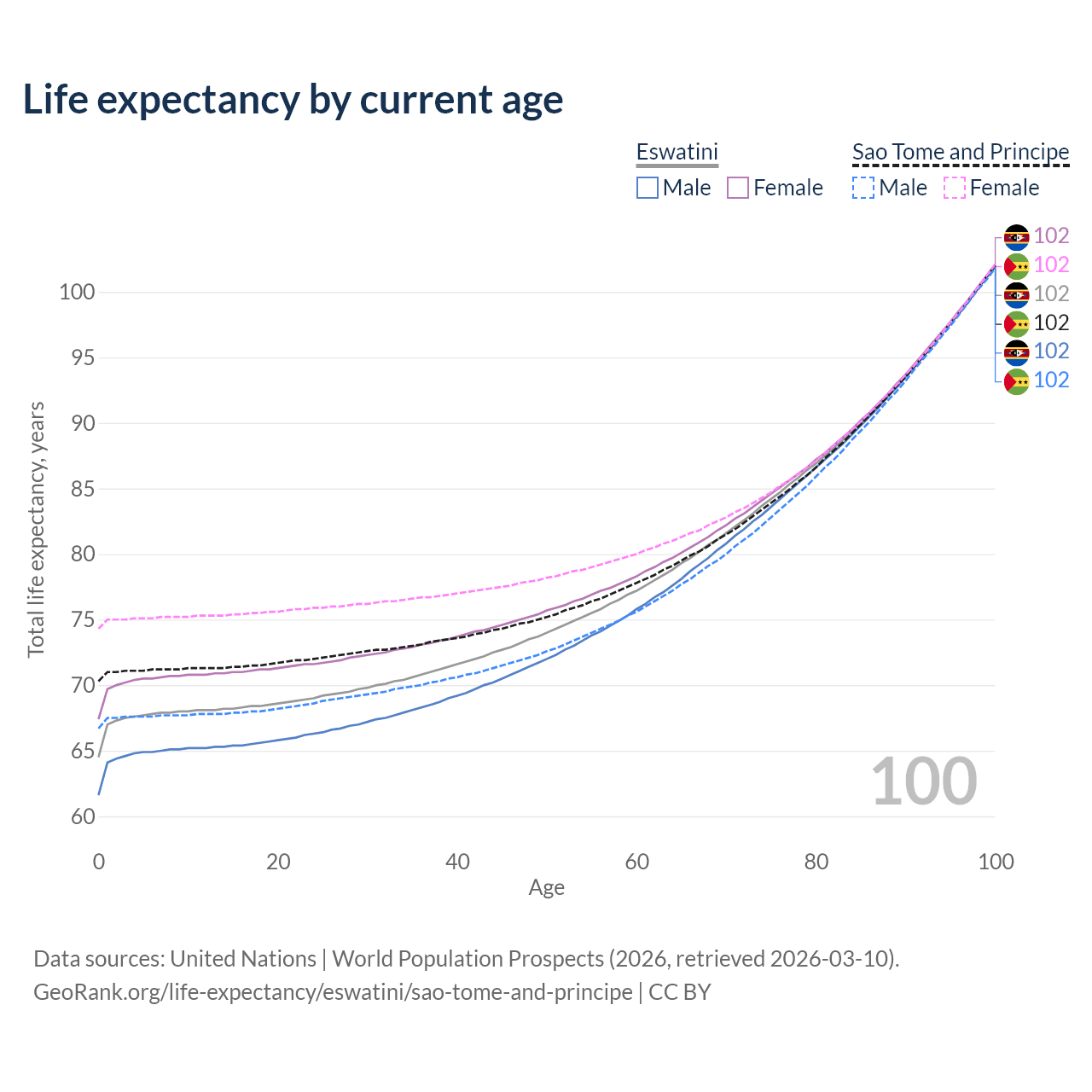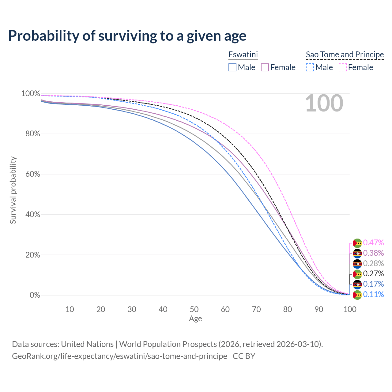 This life expectancy calculator shows the odds of living to 100, 95, 90, and below based on current age for both males and females in Eswatini and Sao Tome and Principe, along with mean and median age of death. The calculations are based on the 2026 life tables (actuarial tables) from the UN World Population Prospects.
